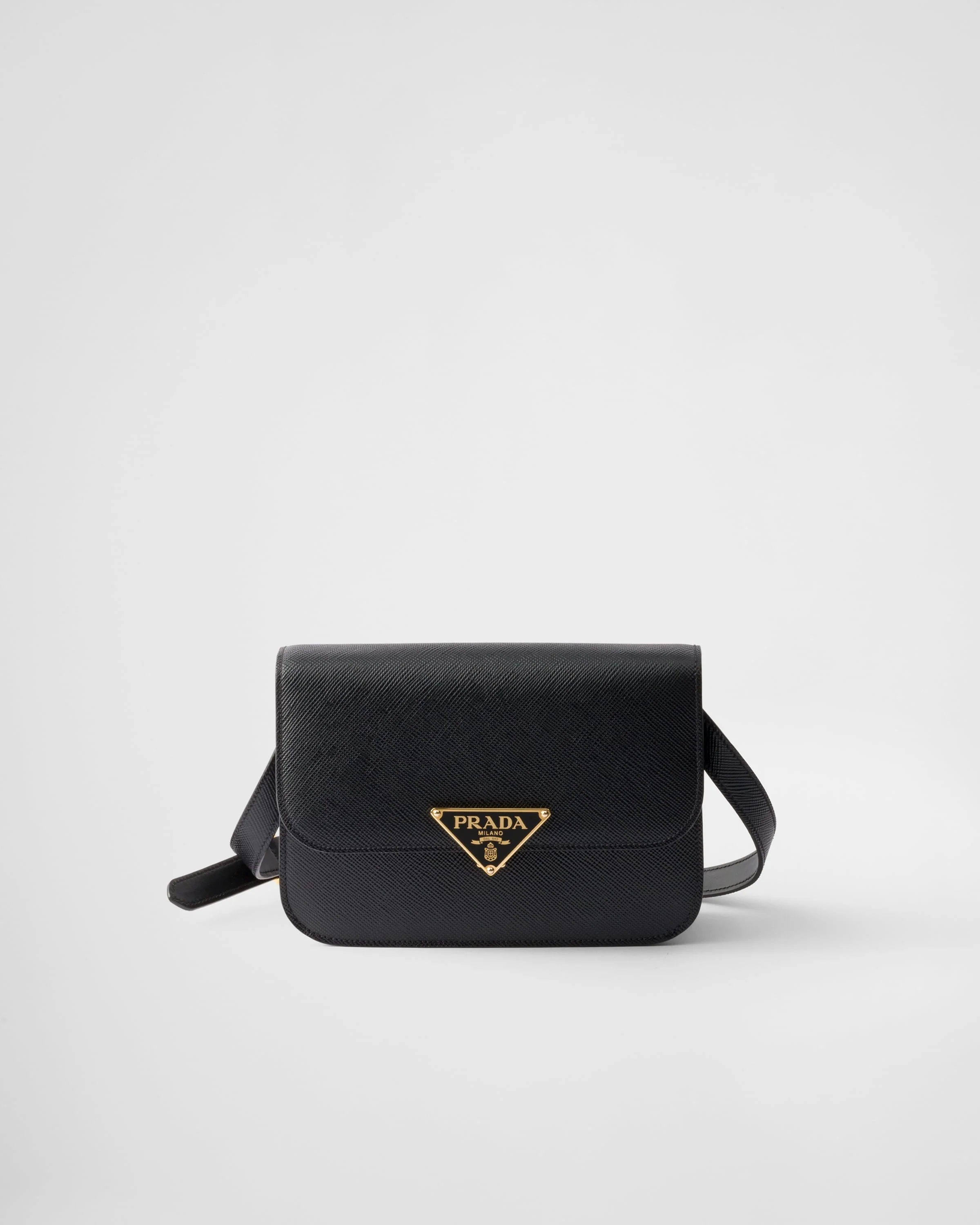 This shoulder bag plays with the concept of simplicity in its lines and compact size, combining versatility and elegance in a refined design. The bag made of Saffiano leather comes with an adjustable shoulder strap enriched with metal hardware, like the iconic triangle logo embellishing the clasp. - Product code: 1BD320_2A4A_F0002_V_YTO - Adjustable leather shoulder strap. Maximum length 116 cm - Minimum length 104 cm - Maximum drop 55 cm - Minimum drop 45 cm - Back pocket - Metal hardware - Enameled metal triangle logo on clasp - Flap closure with logoed push-lock clasp - Logo-print nylon lining with patch pocket - Imported Height: 15cm Width: 22cm Length: 6cm MATERIALS Main material: Calfskin