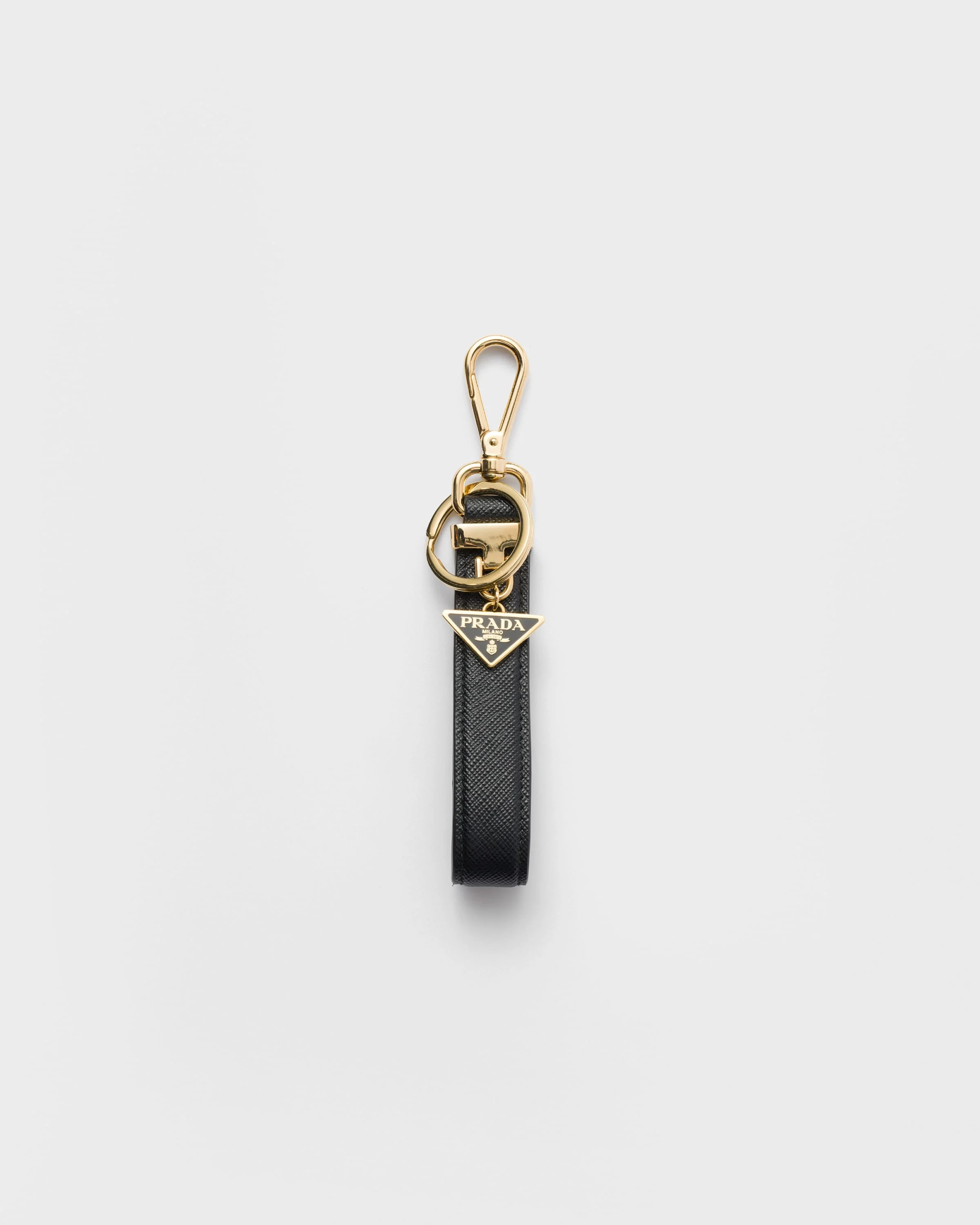 The unmistakable crosshatch texture of Saffiano leather enriches this key ring decorated with the enameled metal triangle logo. - Product code: 1PP185_053_F0002 - Snap-hook and breeze ring - Enameled metal triangle logo charm - Imported Height: 10cm Width: 2cm MATERIALS Main material: Calfskin