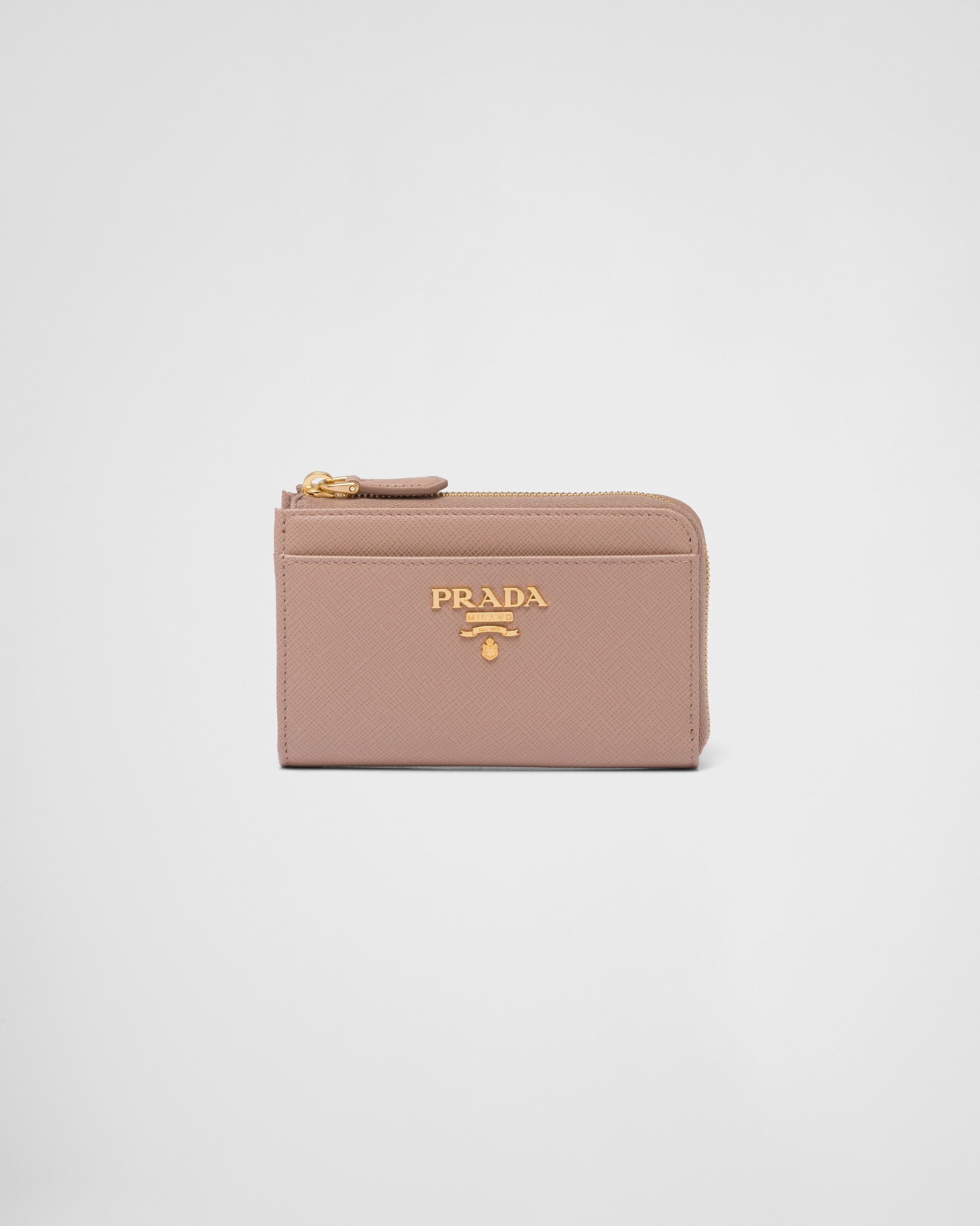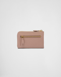 This Saffiano leather keychain is decorated with the metal lettering logo and has card slots. - Product code: 1PP122_QWA_F0236 - Ring with chain for keys - Zipper closure - Metal lettering logo - Two card slots - External zipper pocket - Leather lining - Imported Height: 8.5cm Width: 13cm MATERIALS Main material: Calfskin