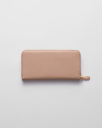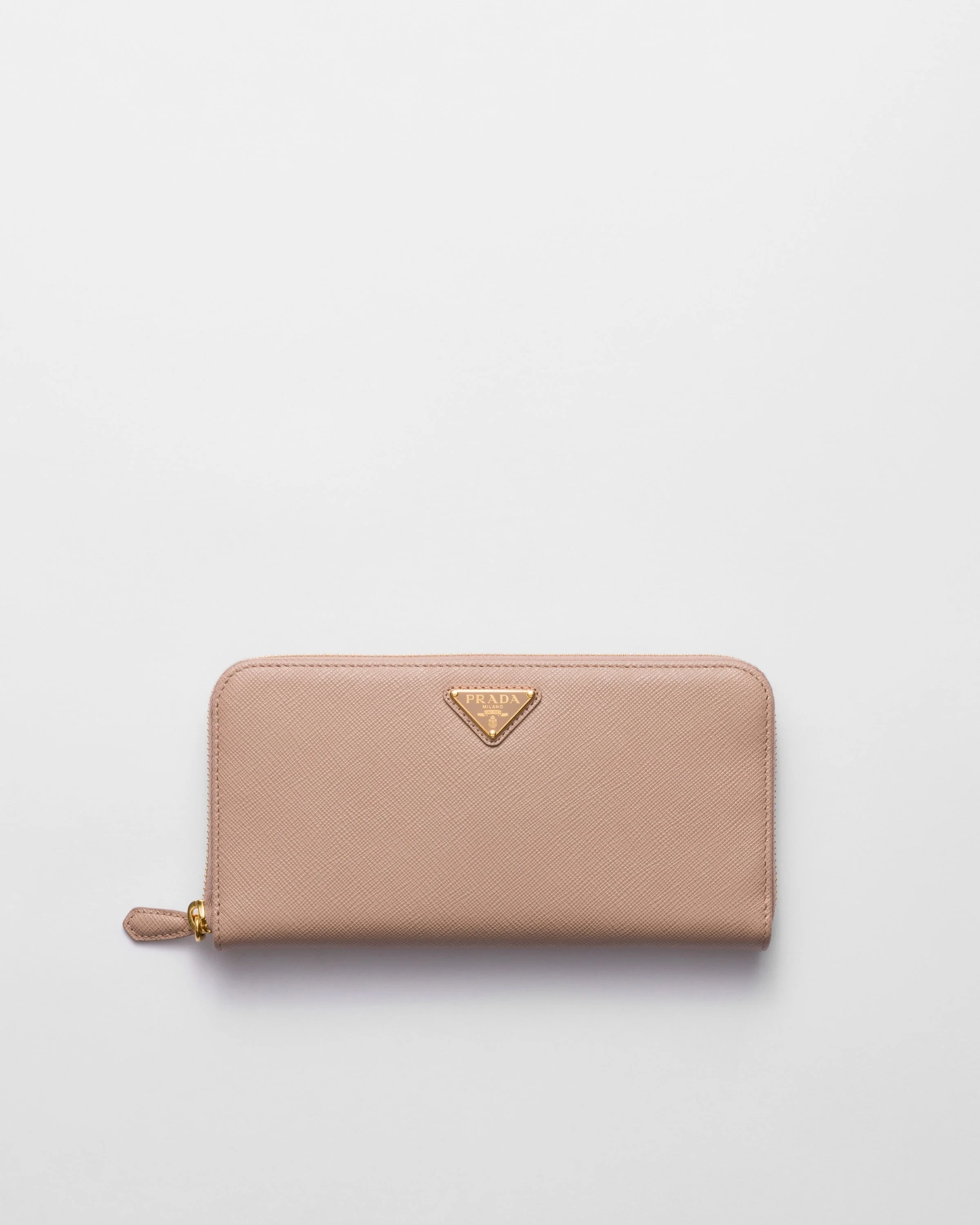 A curved-edged Saffiano leather wallet containing 1 bill compartment with zipper, 12 credit card slots, 6 document pockets and 1 coin compartment with zipper. The piece is finished with the Prada logo and zipper closure. - Product code: 1ML506_QHH_F0236 - Zipper closure - Enameled metal triangle logo - Two bill compartments - Twelve card slots - Two internal pockets - Internal coin pocket with zipper - Moire and Saffiano leather lining - Imported Height: 10.3cm Width: 20cm MATERIALS Main material: Calfskin