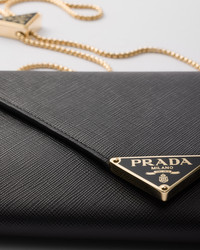 The signature crosshatched texture of Saffiano leather elevates this mini bag. The silhouette blends sleek lines with Prada’s codes, resulting in a sophisticated accessory adorned with the iconic triangle that stands out on the front closure and the elegant shoulder strap. - Product code: 1BP051_NZV_F0002_V_5TO - Detachable, adjustable chain shoulder strap, length: 115 cm - Zipper pocket on the back - Metal hardware - Enameled metal triangle logo closure - Magnetic flap closure - Nappa leather lining with patch pocket and card slots - Imported Height: 11.5cm Width: 20cm MATERIALS Main material: Calfskin