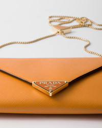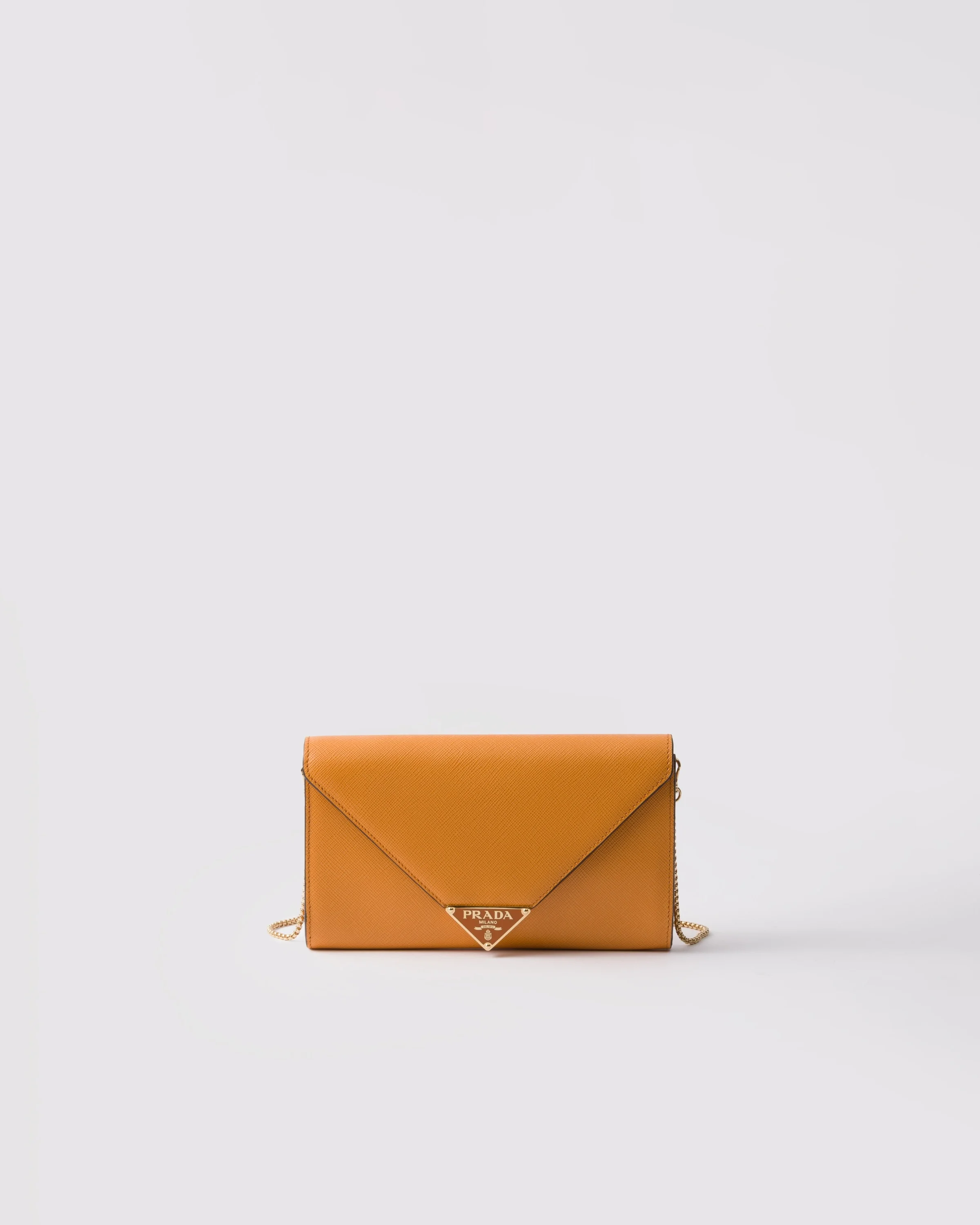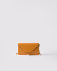 The signature crosshatched texture of Saffiano leather elevates this mini bag. The silhouette blends sleek lines with Prada’s codes, resulting in a sophisticated accessory adorned with the iconic triangle that stands out on the front closure and the elegant shoulder strap. - Product code: 1BP051_NZV_F04GT_V_5TO - Detachable, adjustable chain shoulder strap, length: 115 cm - Zipper pocket on the back - Metal hardware - Enameled metal triangle logo closure - Magnetic flap closure - Nappa leather lining with patch pocket and card slots - Imported Height: 11.5cm Width: 20cm MATERIALS Main material: Calfskin
