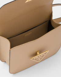 This shoulder bag with a structured classic design is made of Saffiano leather, an iconic material of the brand characterized by its crosshatch texture and waxed finish. The triangle logo, first introduced by Mario Prada on the trunks he designed, decorates the front. Provided with a handle with a novel design, the accessory comes with an adjustable shoulder strap to be worn in different ways. - Product code: 1BD320_2A4A_F0036_V_OTO - Adjustable Saffiano handle - Back pocket - Metal hardware - Enameled metal triangle logo - Flap closure with push-lock logo clasp - Nylon logo-print lining with patch pocket - Height: 15cm - Length: 6cm - Width: 22cm MATERIALS Leather