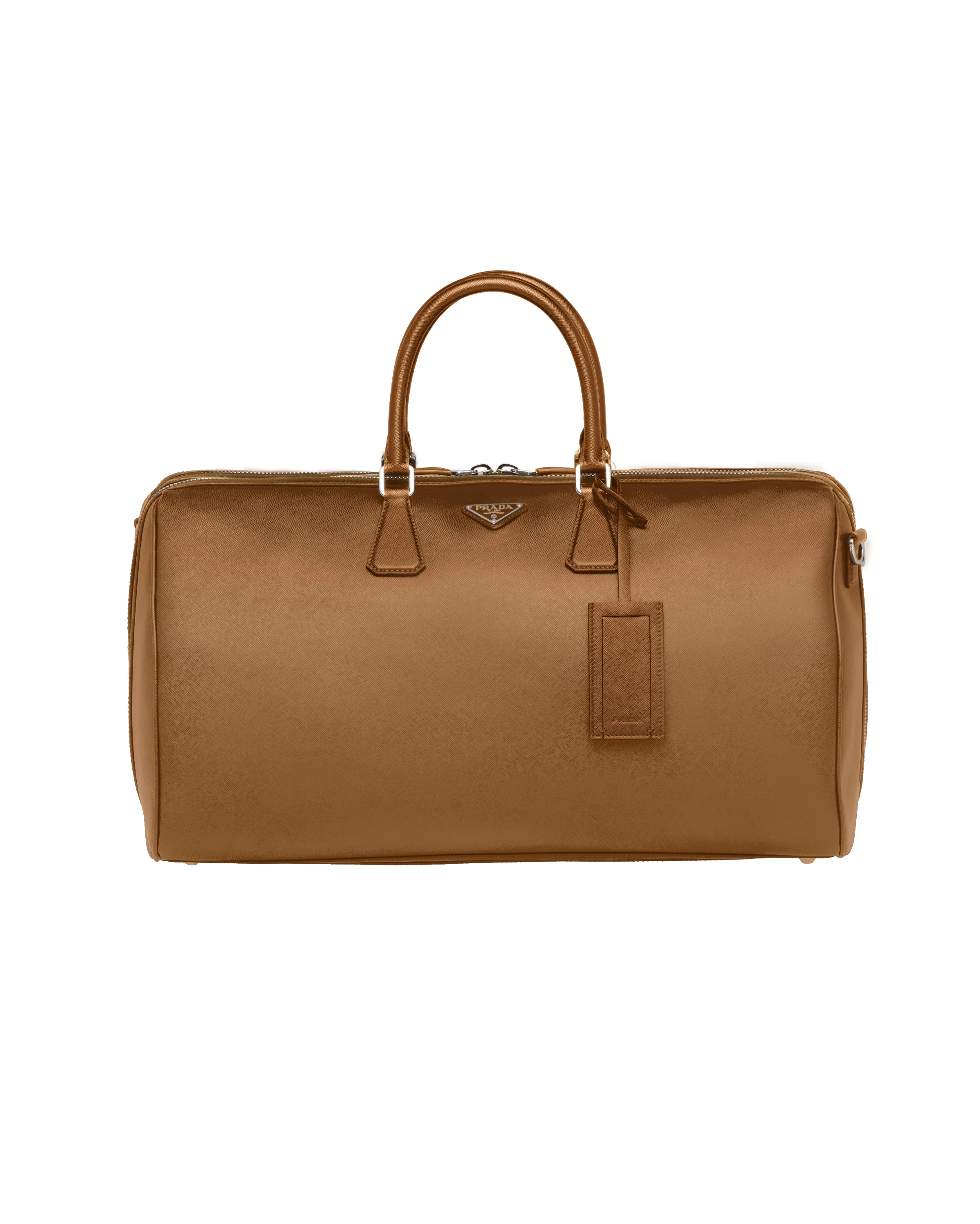 This elegant duffle bag in Saffiano leather with all-around zipper and nylon shoulder strap has rigorous design. The leather name tag and metal lock engraved with the lettering logo decorate this accessory. - Product code: 2VC018_9Z2_F0401_V_OOO - Leather handles - Detachable adjustable woven nylon shoulder strap - Enameled metal triangle logo on the front - Zipper closure - Removable leather name tag - Interior with two zipped pockets - Prada logo nylon lining - Small metal feet - Imported Height: 27.5cm Width: 50cm Length: 25cm MATERIALS Main material: Calfskin