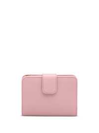 Saffiano leather wallet Highlights - Rose pink - Leather - Enamel triangle logo - Bi-fold design - Top zip fastening - Press-stud fastening - Card slots Composition Outer: Calf Leather 100% SIZE & FIT Measurement LENGTH 4.72 in(12 cm) WIDTH 3.34 in(8.5 cm)