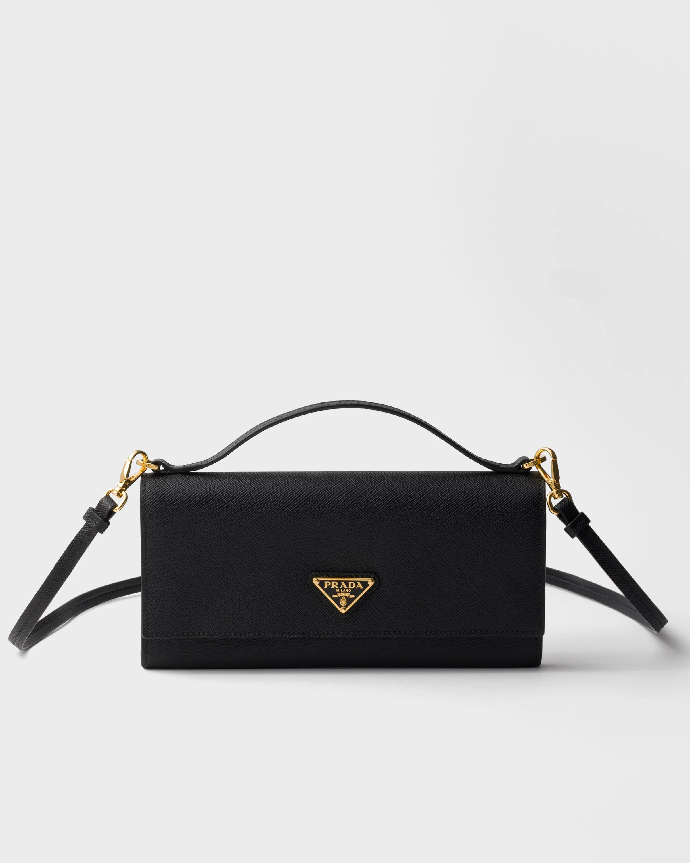 This wallet made of Saffiano leather with refined details has a pragmatic and sophisticated design. The accessory is completed by the shoulder strap which gives it a functional and versatile character. - Product code: 1MT042_QHH_F0002 - Snap closure - Enameled metal triangle logo - One bill compartment - Six card slots - One internal pocket - Zippered coin compartment - Moire and Saffiano leather lining - Adjustable and detachable Saffiano and leather shoulder strap - Imported Height: 9.5cm Width: 20cm MATERIALS Main material: Calfskin