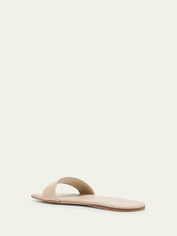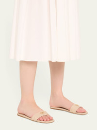 Prada smooth leather sandals with signature logo triangle accent 0.17 in / 5 mm flat heel Open toe Wide band upper Slide style Leather outsole Made in Italy