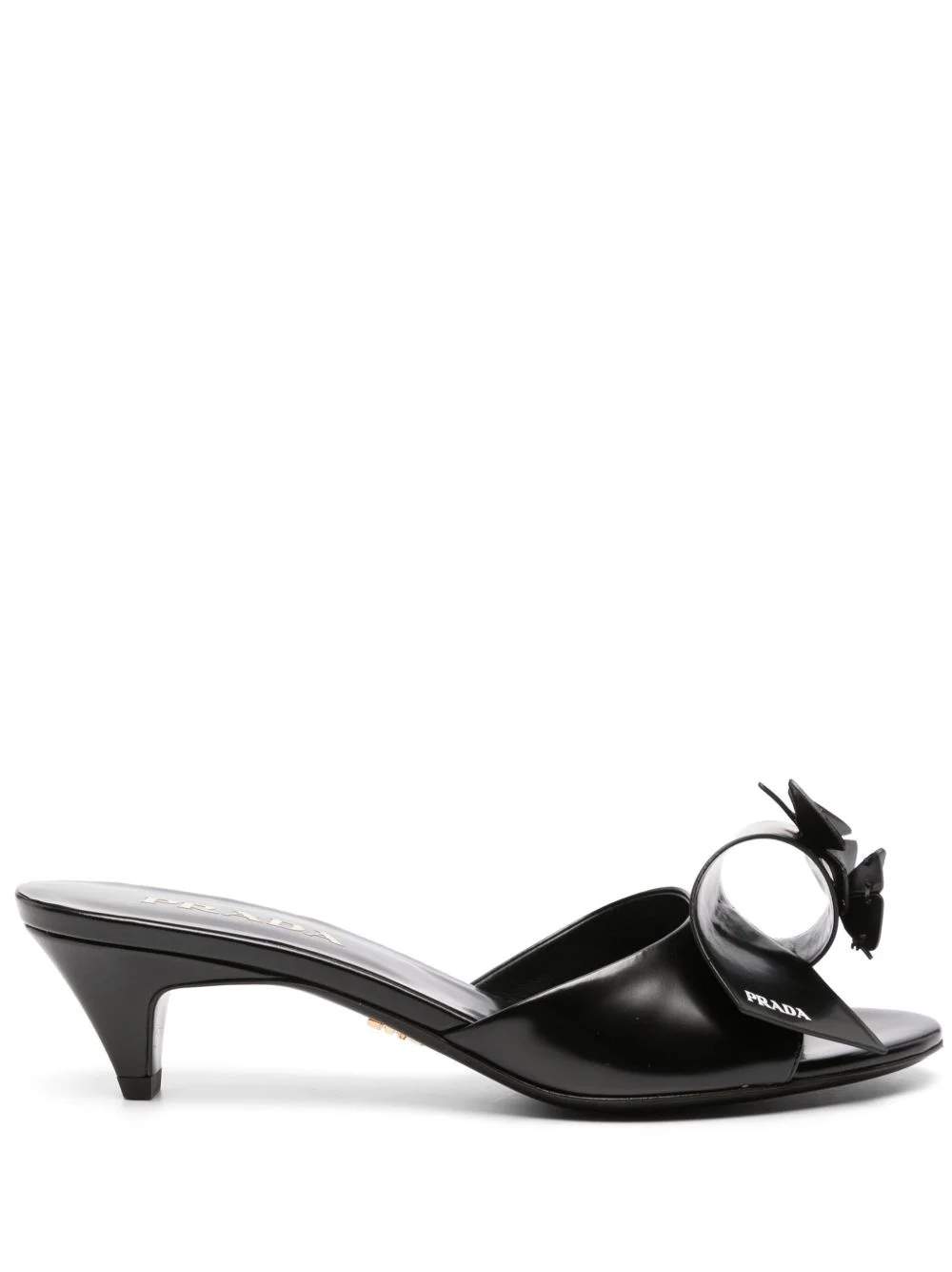 50mm floral-applique sandals Crafted from buttery-soft leather, these Prada mules are punctuated with floral applique detailing at the toe. Highlights - Black - Calf leather - Logo print to the front - Floral applique - Round toe - Slip-on style - Branded insole - Mid cone heel Composition Lining: Calf Leather 100% Outer: Calf Leather 100% Sole: Calf Leather 100% SIZE & FIT Measurement HEEL 1.96 in(5 cm)
