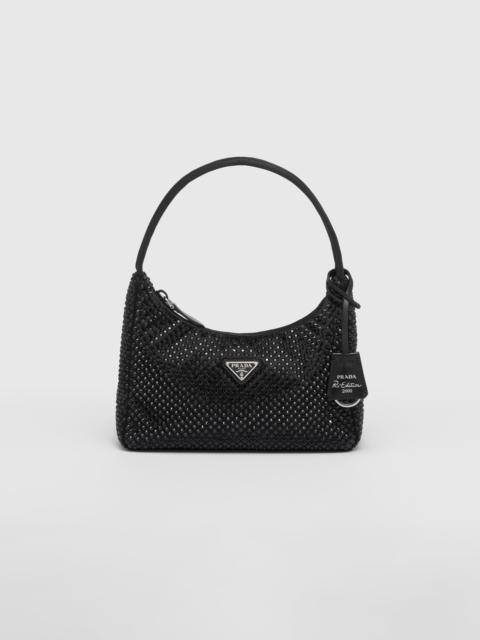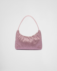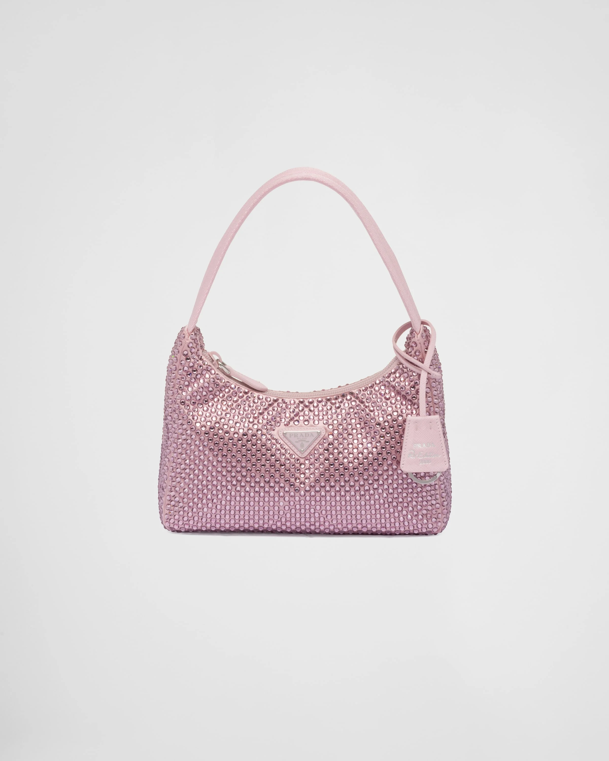 This mini hobo bag, an iconic Prada style, comes in a luxurious satin version studded with crystals and decorated with the emblematic enamel triangle logo. - Product code: 1BC515_2AWL_F0E18_V_OOO - All-over synthetic crystals - Zipper closure - Enameled metal triangle logo - Silk satin lining - Imported Height: 17cm Width: 22cm Length: 6cm MATERIALS Main material: Silk viscose