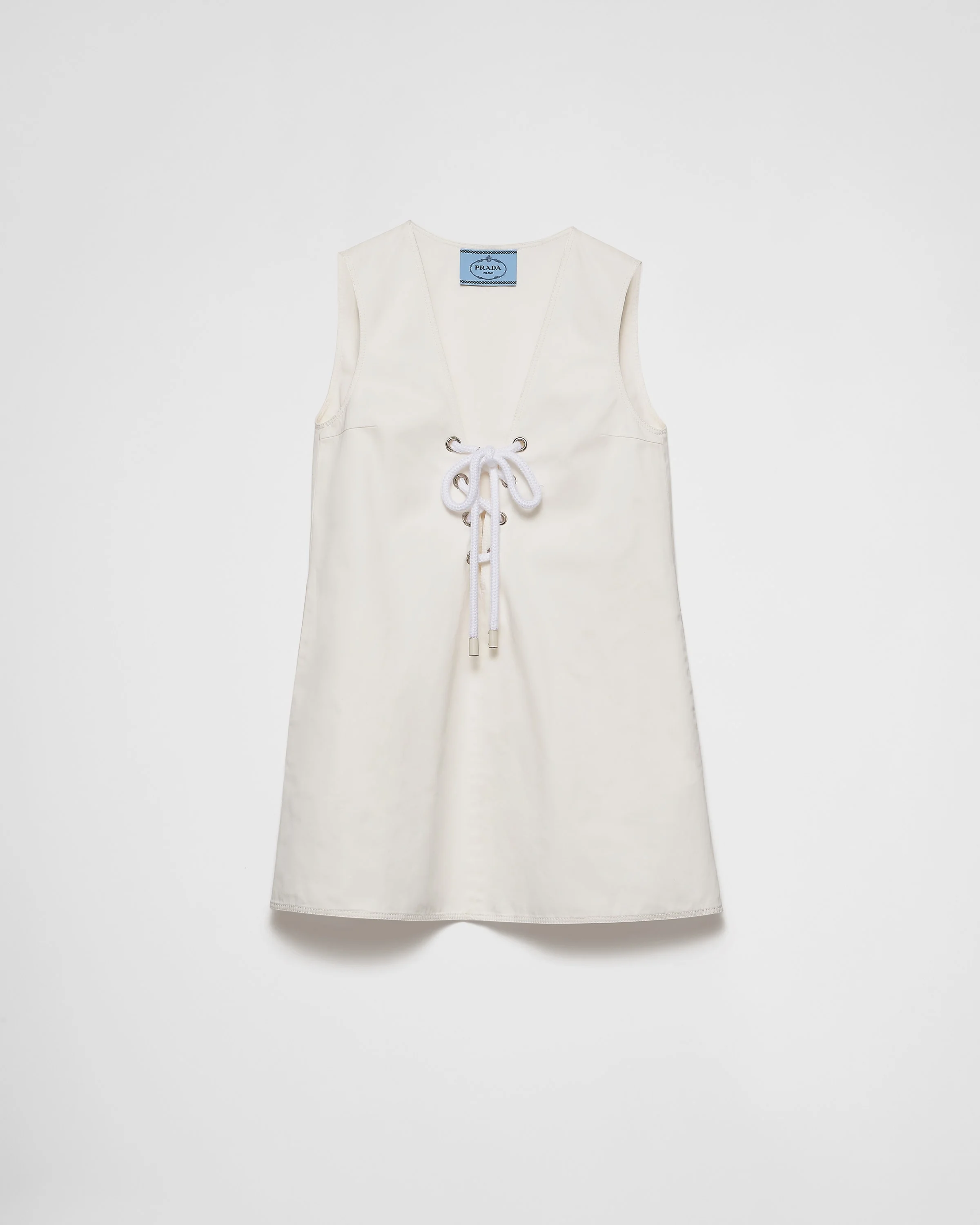 The simple refinement of this satin dress is created by clean lines that form the silhouette with plunging V neckline, embellished with a cord detail inspired by nautical style. - Product code: P3P00_16E2_F0009_S_OOO - Flared fit - V-neck - Sleeveless - Fabric triangle logo - Flared hem - Imported - The model is 179 cm tall and wears a size 38 Height: 80cm MATERIALS Main material: 100% cotton