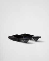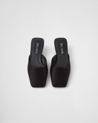 Modernist lines and architectural volumes define the silhouette of these satin mules with sophisticated allure. The essential, iconic geometric shape of the Prada triangle inspires the design of the heel that enhances the tapered, feminine style with a unique, contemporary touch. - Produktcode: 1I479N_049_F0002_F_A035 - Leather sole - Varnished heel with logo, height: 35 mm - Eingeführt