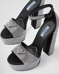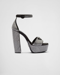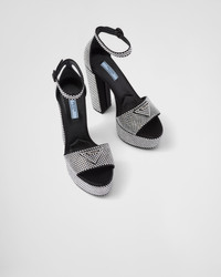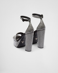 Bold allure characterizes these high-heeled satin platform sandals studded with crystals that create a play of light and iridescent reflections on the surface. The triangle logo appearing as a slightly padded leather detail adds a modernist note. - Code du produit: 1XP53B_2AWL_F0T7O_F_135 - All-over synthetic crystals - Covered buckle - Metal lettering logo - Leather and rubber sole - Metal lettering logo - 135 mm satin-covered heel - 40 mm satin-covered platform - Importe MATERIALS Fabric