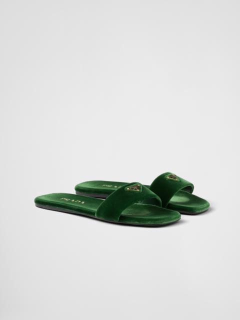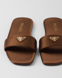 These flat slides have a sleek design enriched by the sophisticated satin finish that gives the footwear refined allure. The flat, sleek silhouette with a square toe is completed by the iconic signature of the enameled metal triangle logo. - Product code: 1XX355_049_F0005_F_D005 - Enameled metal triangle logo - Monoblock leather sole, 5 mm, with hot-stamped logo - Satin-covered insole - Imported MATERIALS Main material: Silk viscose
