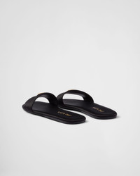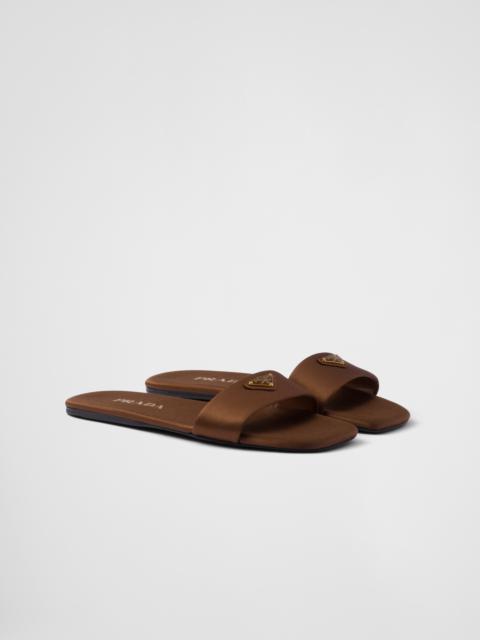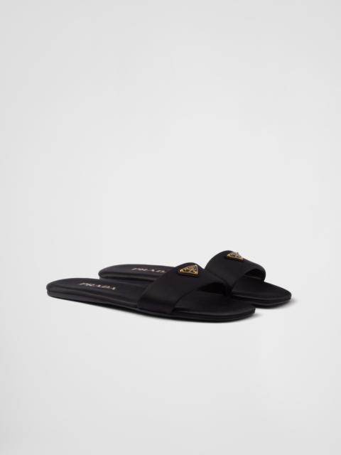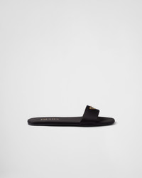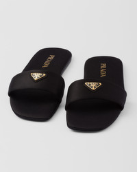 These flat slides have a sleek design enriched by the sophisticated satin finish that gives the footwear refined allure. The flat, sleek silhouette with a square toe is completed by the iconic signature of the enameled metal triangle logo. - Product code: 1XX355_049_F0002_F_D005 - Enameled metal triangle logo - Monoblock leather sole, 5 mm, with hot-stamped logo - Satin-covered insole - Imported MATERIALS Main material: Silk viscose