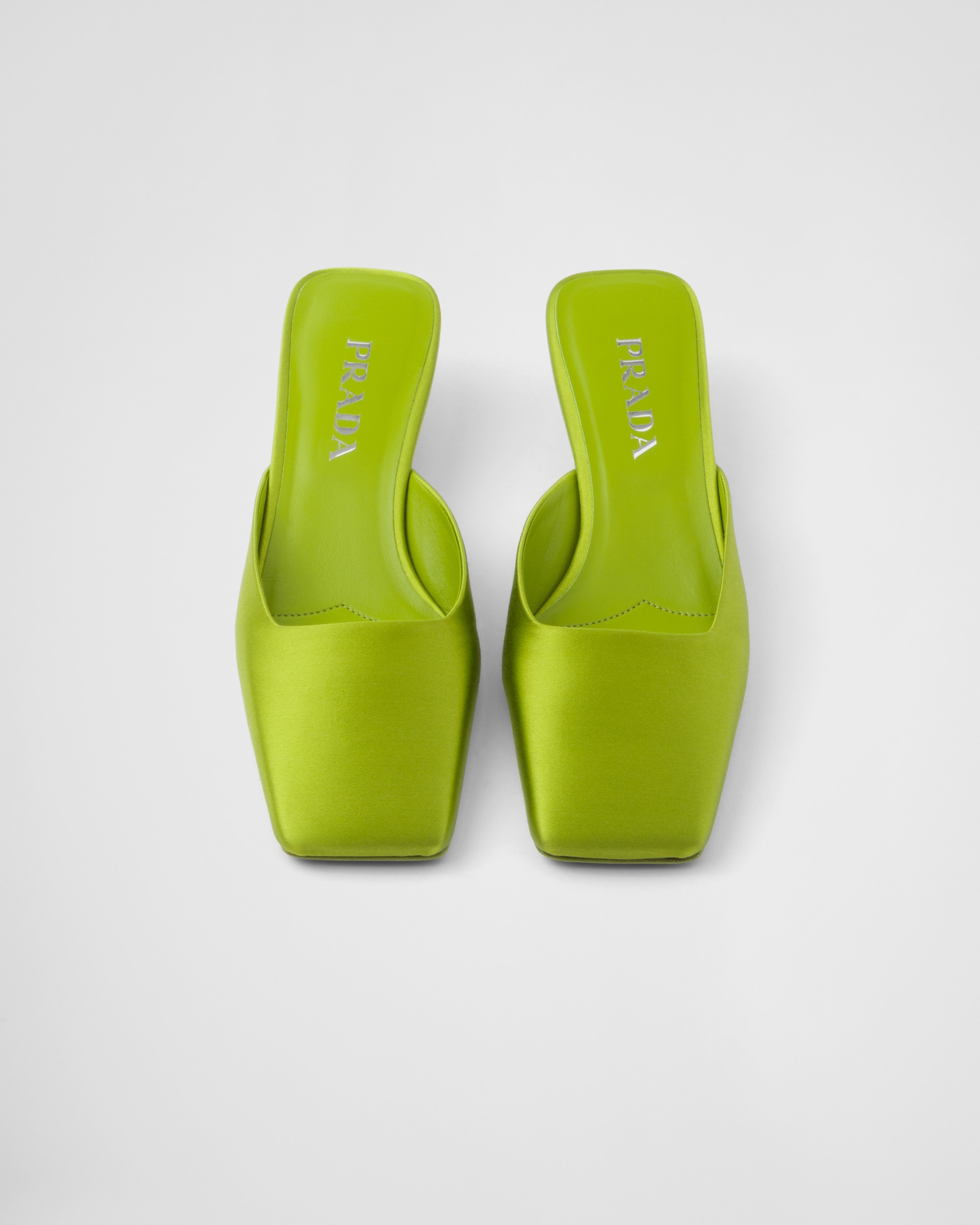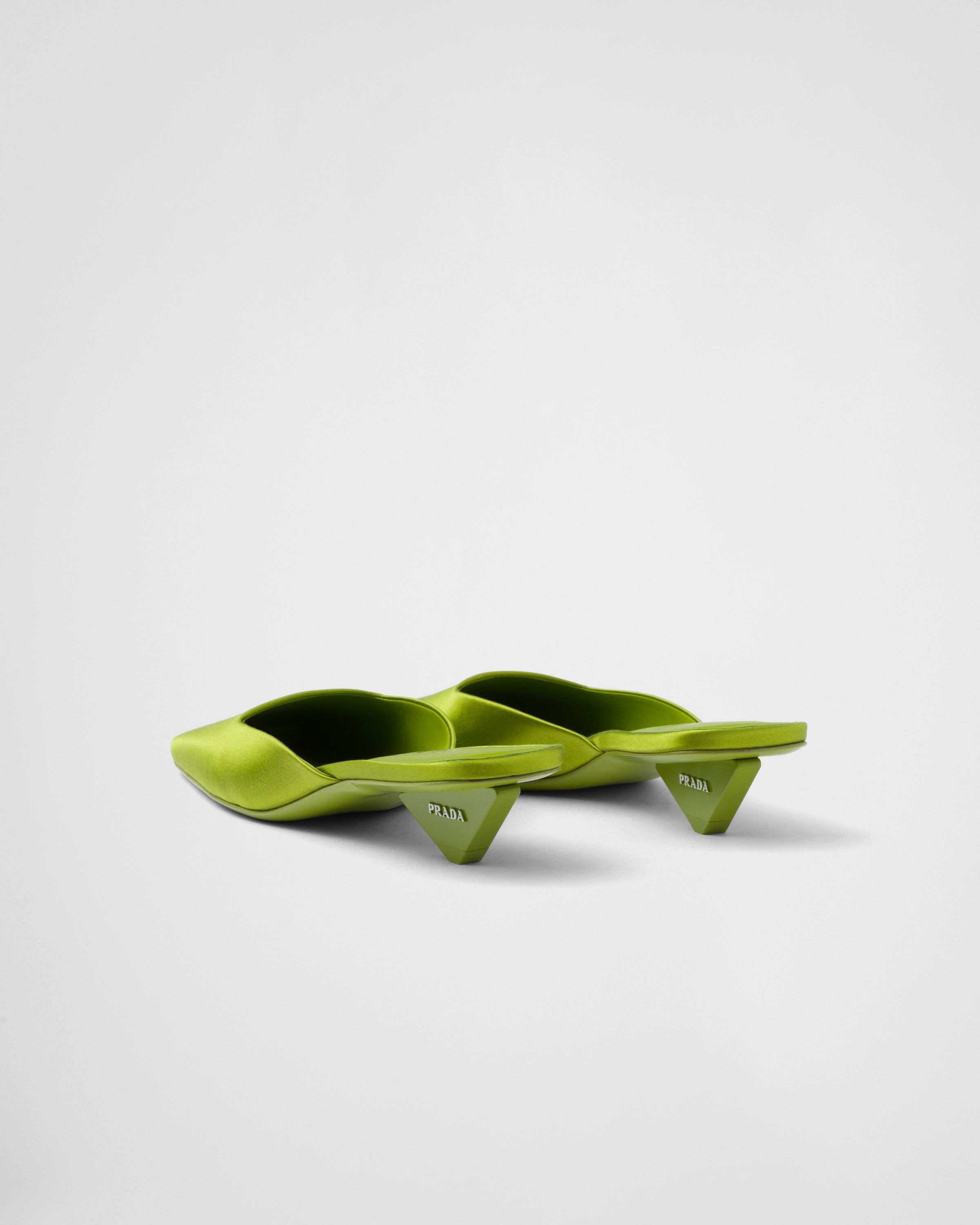 Modernist lines and architectural volumes define the silhouette of these satin mules with sophisticated allure. The essential, iconic geometric shape of the Prada triangle inspires the design of the heel that enhances the tapered, feminine style with a unique, contemporary touch. - Product code: 1I479N_049_F0613_F_A035 - Leather sole - Varnished heel with logo, height: 35 mm - Imported MATERIALS Viscose