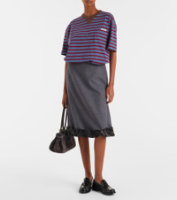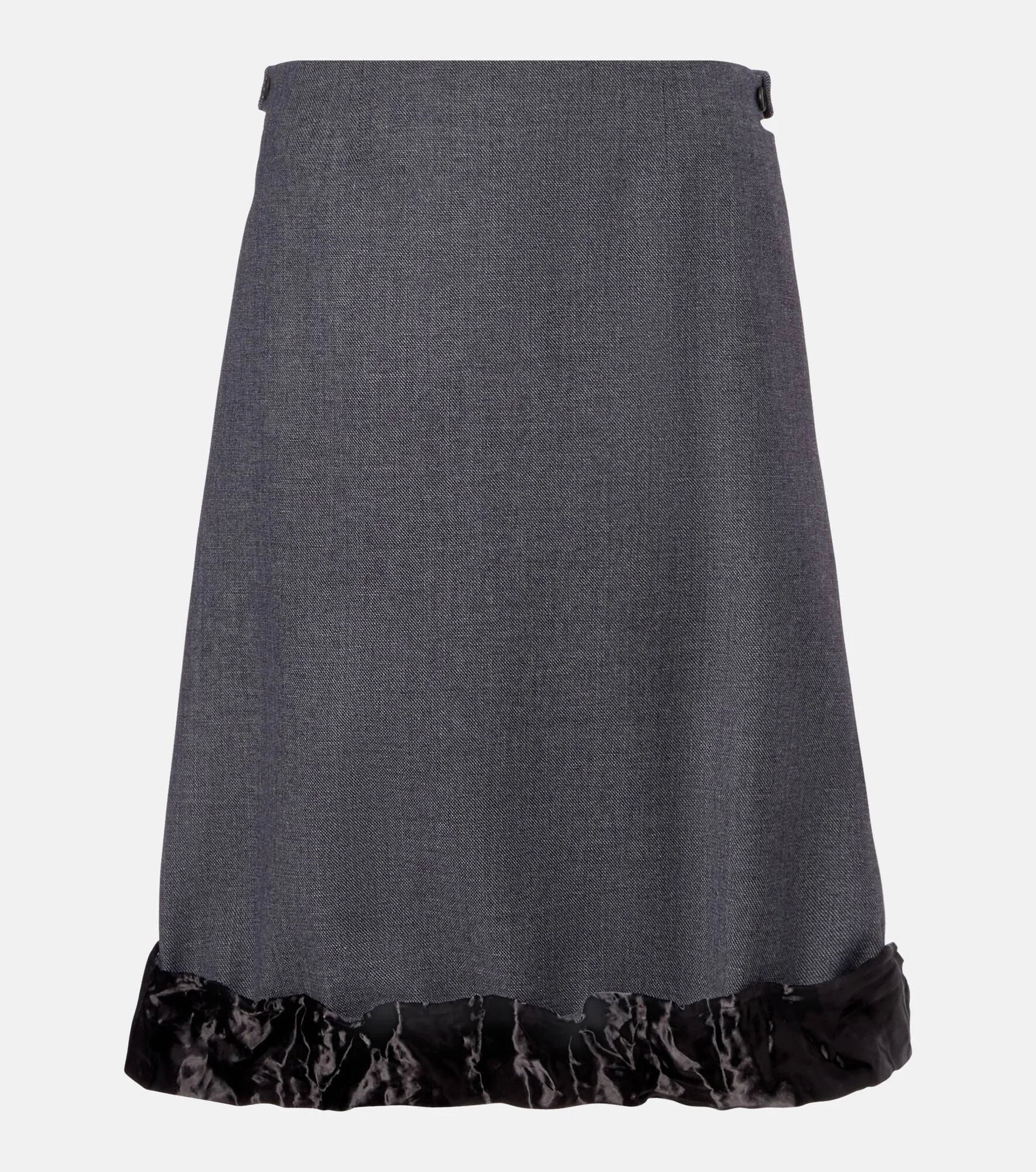 Prada embodies modern sophistication, blending timeless Italian craftsmanship with an innovative spirit. Crafted in Italy from pure wool with a satin-trimmed hemline, this midi skirt features adjustable tabs at the waist. Product Details - Material: 100% wool - Care instructions: dry clean - Made in Italy - Designer color name: Gray - Item color: gray - Trim: 96% metallic fibres, 4% silk - Contains non-textile parts of animal origin - Lining: 100% cupro (recycled) - Closure: concealed zipped side - Adjustable tabs at the waist - Pockets: side slit pockets - Item number: P01110570 Size & Fit - Fits large to size - we recommend trying one size smaller - Non-stretchy fabric - Sits low on the hips - The model seen in the picture is 178cm-5'10" and wearing a size IT 38