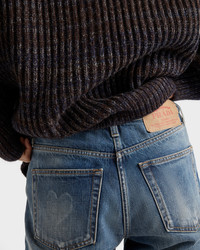 These tapered, low-rise jeans are made of high-quality denim enriched with a washed finish. Contrasting top-stitching and distressed details complete the garment with vintage charm decorated with an archive logo printed on the label. - Product code: GFP530_164B_F0008_S_OOO - Washed treatment - Tapered fit - Low-rise waist - Hem width: 18.5 cm, size: 25 - Button fly - Contrasting top-stitching - Total length 112 cm, Size: 25 - Pressed garment - Prada Milano logo label on the back - Imported Height: 110cm MATERIALS Main material: 100% cotton