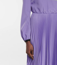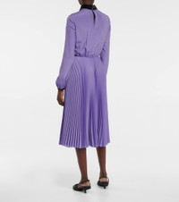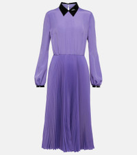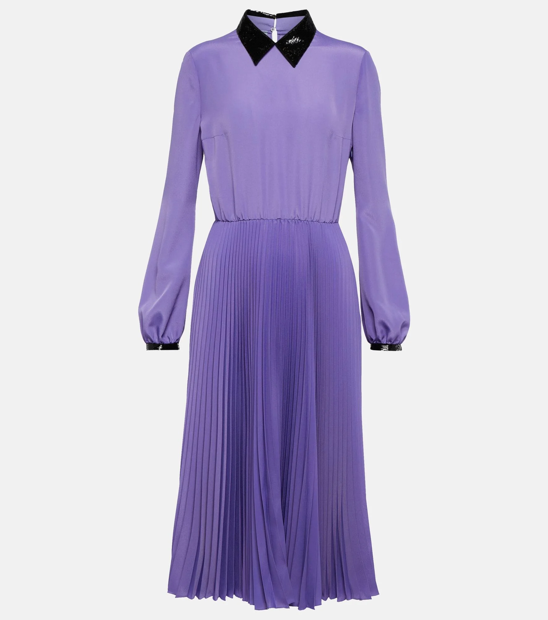 Prada brings fluidity and dynamism to your wardrobe with this vibrant purple midi dress. Made from crepe, it has lantern sleeves, sequins at the contrasting black cuffs and shirt collar, and a cinched waist that flares to a tightly pleated midi skirt. With bold colors and feminine silhouettes, dare to be a leader, not a follower, in this dress. Product Details - Made in Italy - Buttoned cuffs - Designer color name: Iris - Closure: buttoned back - Care instructions: dry clean - Item number: P00623606 Size & Fit - True to size - Cinched waist - The model seen in the picture is 178cm-5'10" and wearing a size IT 40