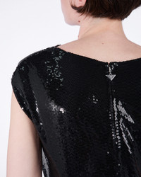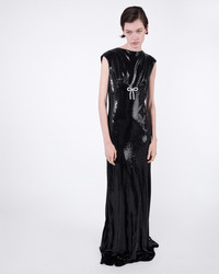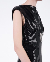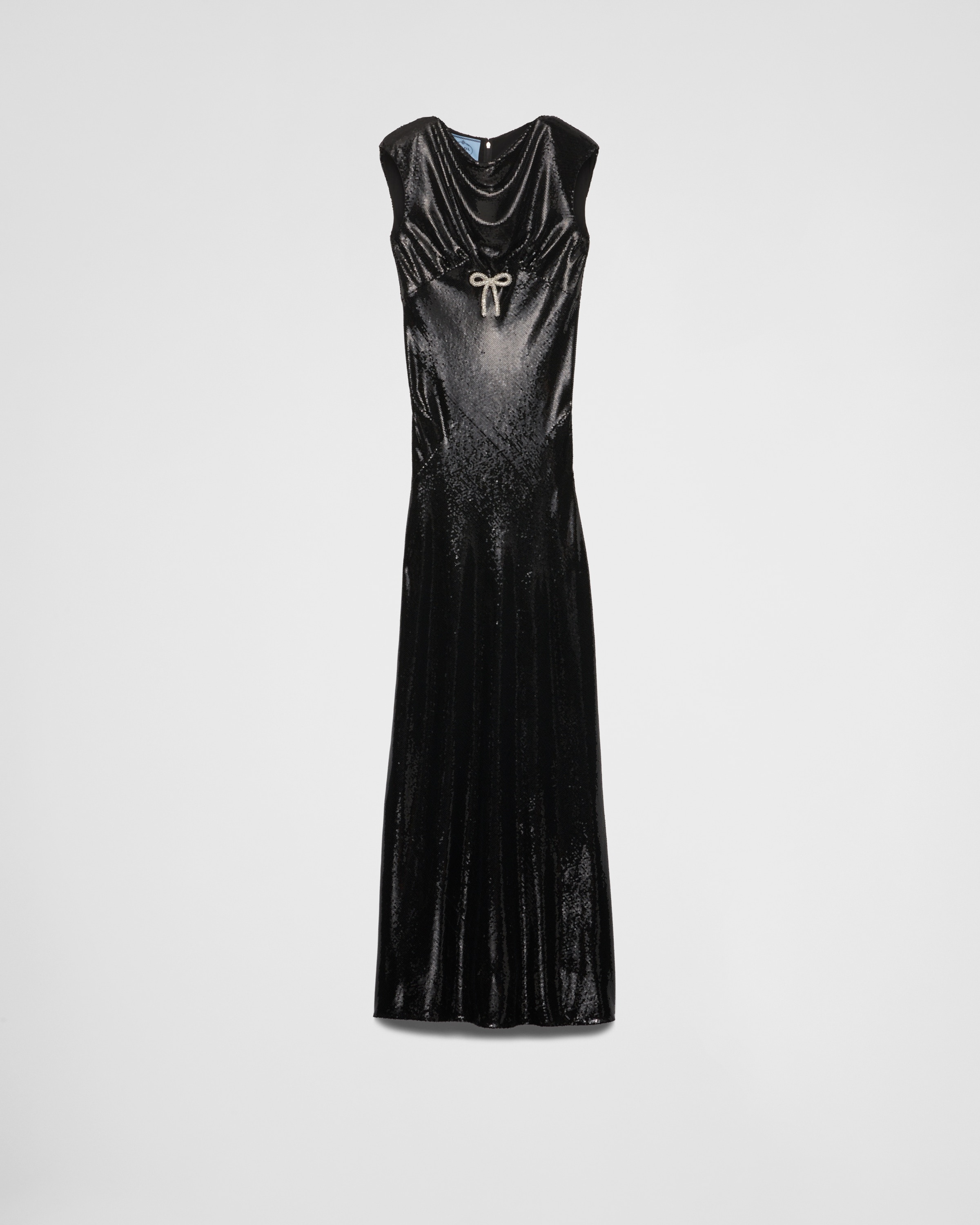A subtle blend of modernity and tradition is achieved in this elegant satin jersey dress covered in sequins. The embroidered bow on the front bodice creates a sophisticated contrast. - Produktcode: P3O55R_155Y_F0002_S_OOO - Long fit - Lined - Straight neckline - Centre back zip fastening - Short sleeves - Metal triangle logo pendant - Flared hem - Embroidered bow detail on front bodice cut out - Eingefuhrt - The model is 179 cm tall and wears a size 38 Hohe: 160cm MATERIALS Hauptmaterial: 100% viscose