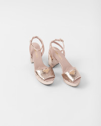 These elegant platform sandals with contemporary allure are enhanced by the sophisticated touch of satin illuminated with tonal sequins. The enameled metal triangle logo completes the refined footwear with its iconic signature touch. - Product code: 1XP48B_959_F0770_F_DD95 - Upper with sequined embellishment and ankle strap with covered buckle - Enameled metal triangle logo - Leather and rubber sole with metal lettering logo - 95 mm sequin-covered heel - 30 mm sequin-covered platform - Imported MATERIALS Leather