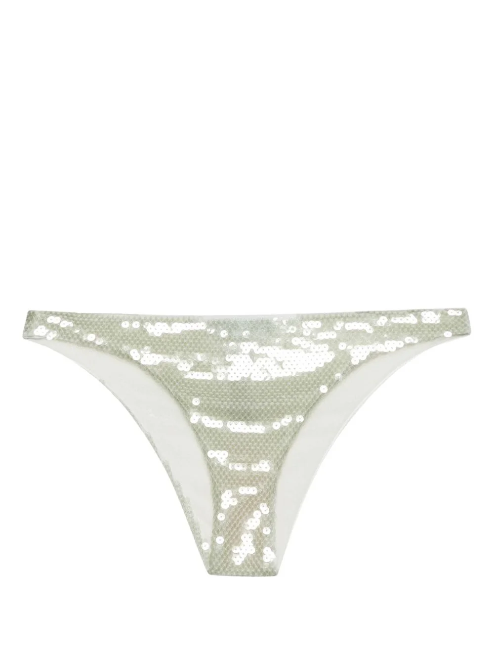 sequinned tulle bikini bottoms Highlights - Light green - Tulle panels - Sequin embellishment - Slip-on style - Mesh lining - Be mindful to try on swimwear over your own garments. Composition Outer: Polyamide 93%, Elastane 7% Lining: Recycled Polyester 93%, Elastane 7% Washing instructions Hand Wash