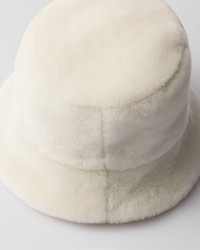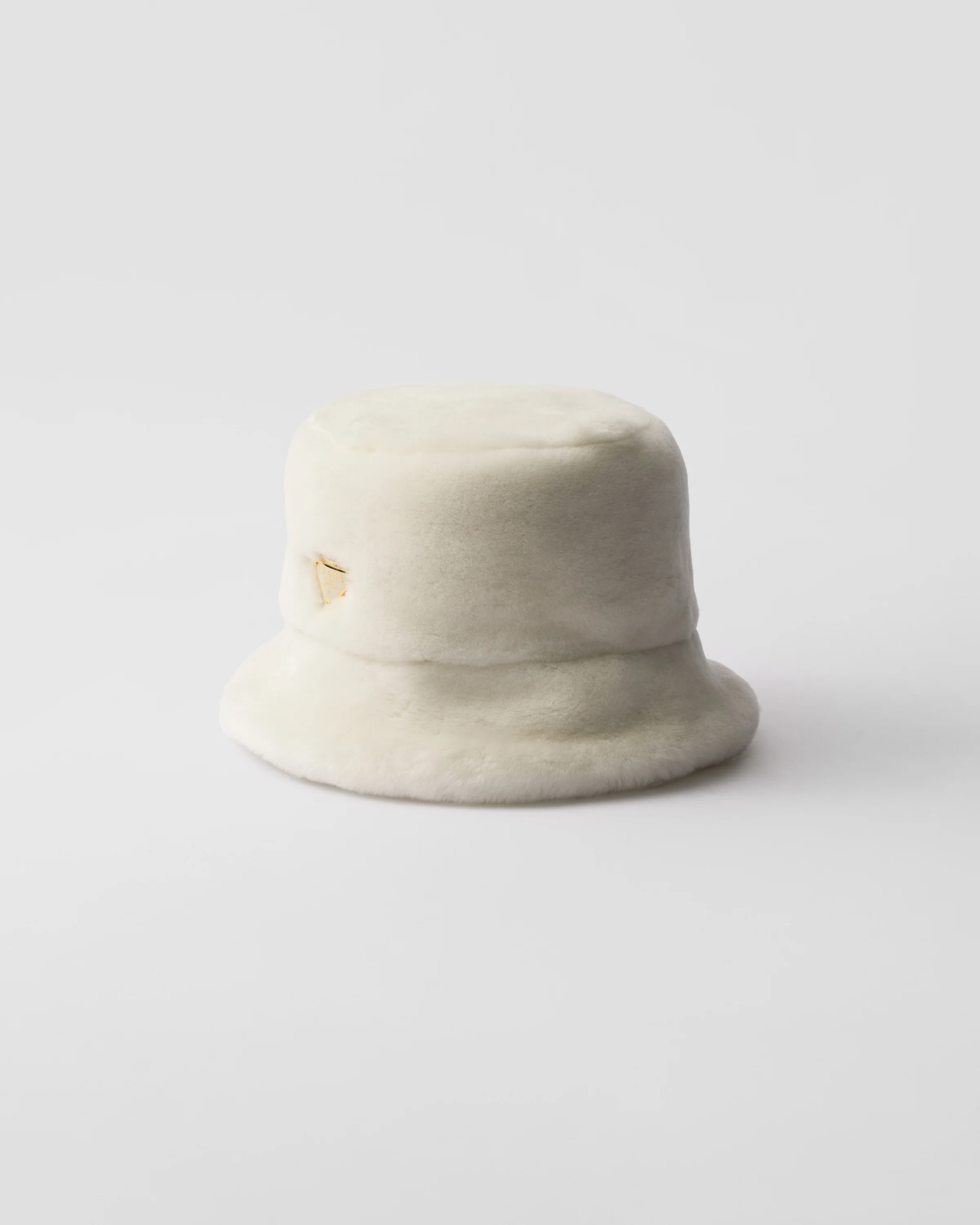 The bucket hat, an iconic accessory that distinguishes Prada collections, is made of shearling and decorated with the enameled metal triangle logo. - Product code: 1HC137_2EC9_F097W - Enameled metal triangle logo - Silk lining - Imported MATERIALS Main material: Lambskin
