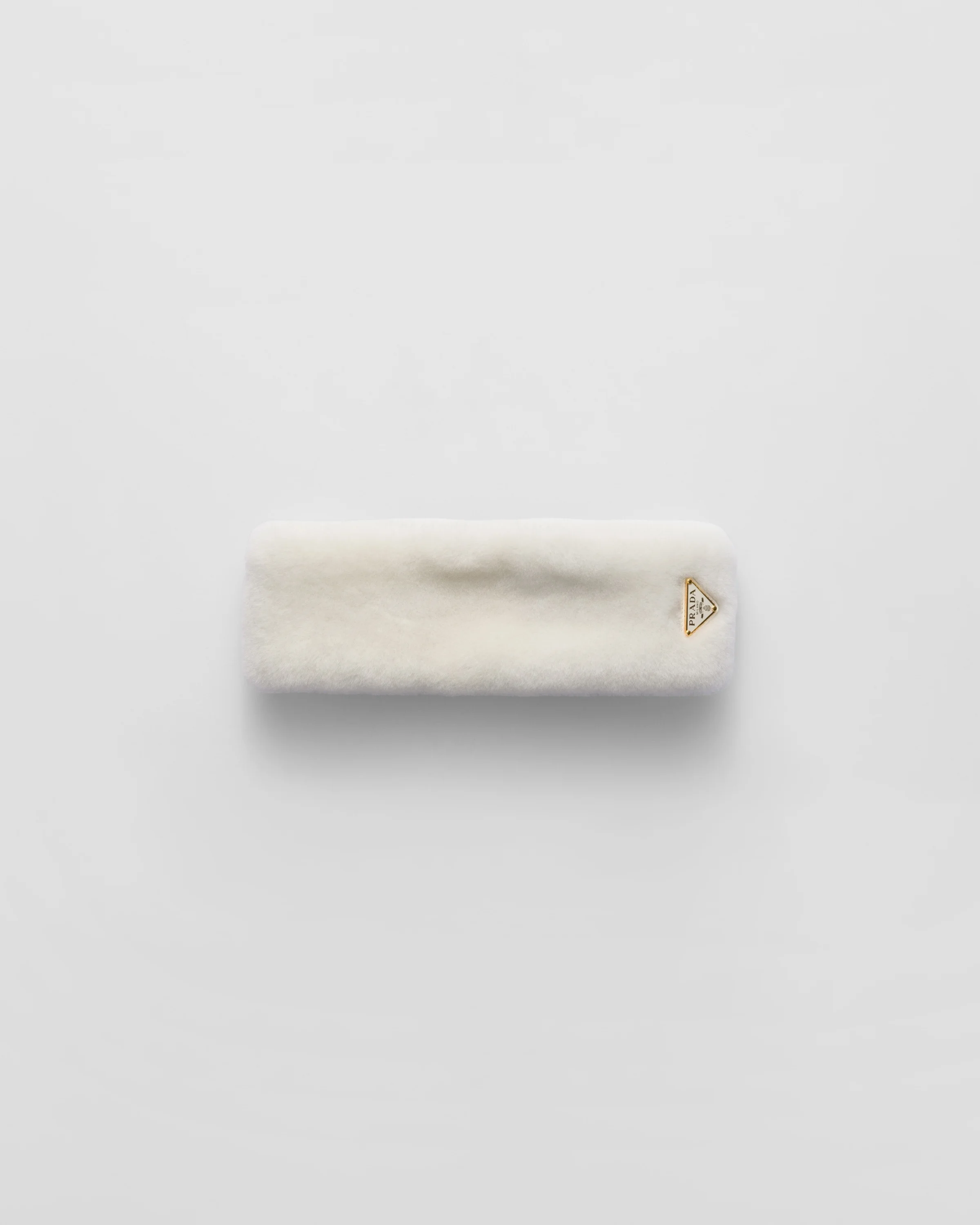 A sporty inspiration and winter moods merge in the design of this shearling headband decorated with the enameled metal triangle logo. - Product code: 1IH031_2EC9_F097W - Enameled metal triangle logo - Hypoallergenic and nickel free materials - Imported Height: 7cm Width: 7cm MATERIALS Main material: Lambskin