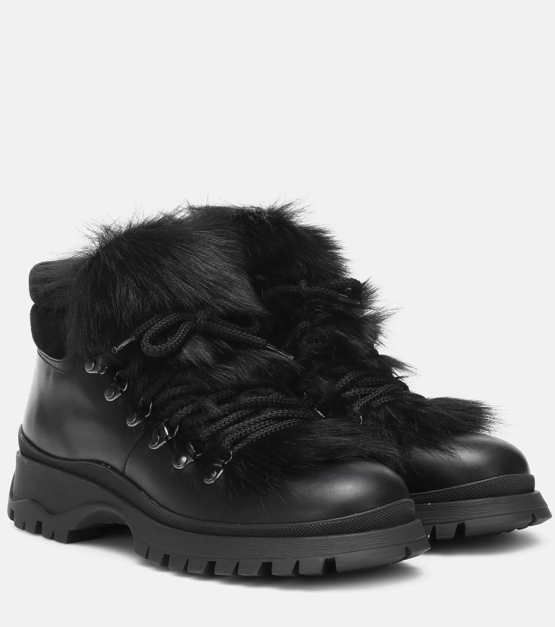 Prada updates this pair of classic ankle boots with a luxurious effect, trimming the black design with sumptuous shearling. Made in Italy from leather, the style works an inviting combination of high style and high comfort – note its padded necks and tongues, and its cleated rubber soles. Wear yours as a tough counterpoint to romantic dresses. Product Details - Lining: leather - Sole: leather insole, rubber sole - Toe shape: round toe - Upper: leather - Closure: lace-up - Designer color name: Black - Made in Italy - Trim: shearling - Item number: P00412481 Size & Fit - True to size - European sizes - 4cm-1.5" heel (size EU 38) - 2cm-1" platform (size EU 38)
