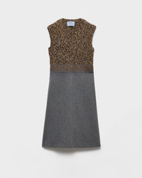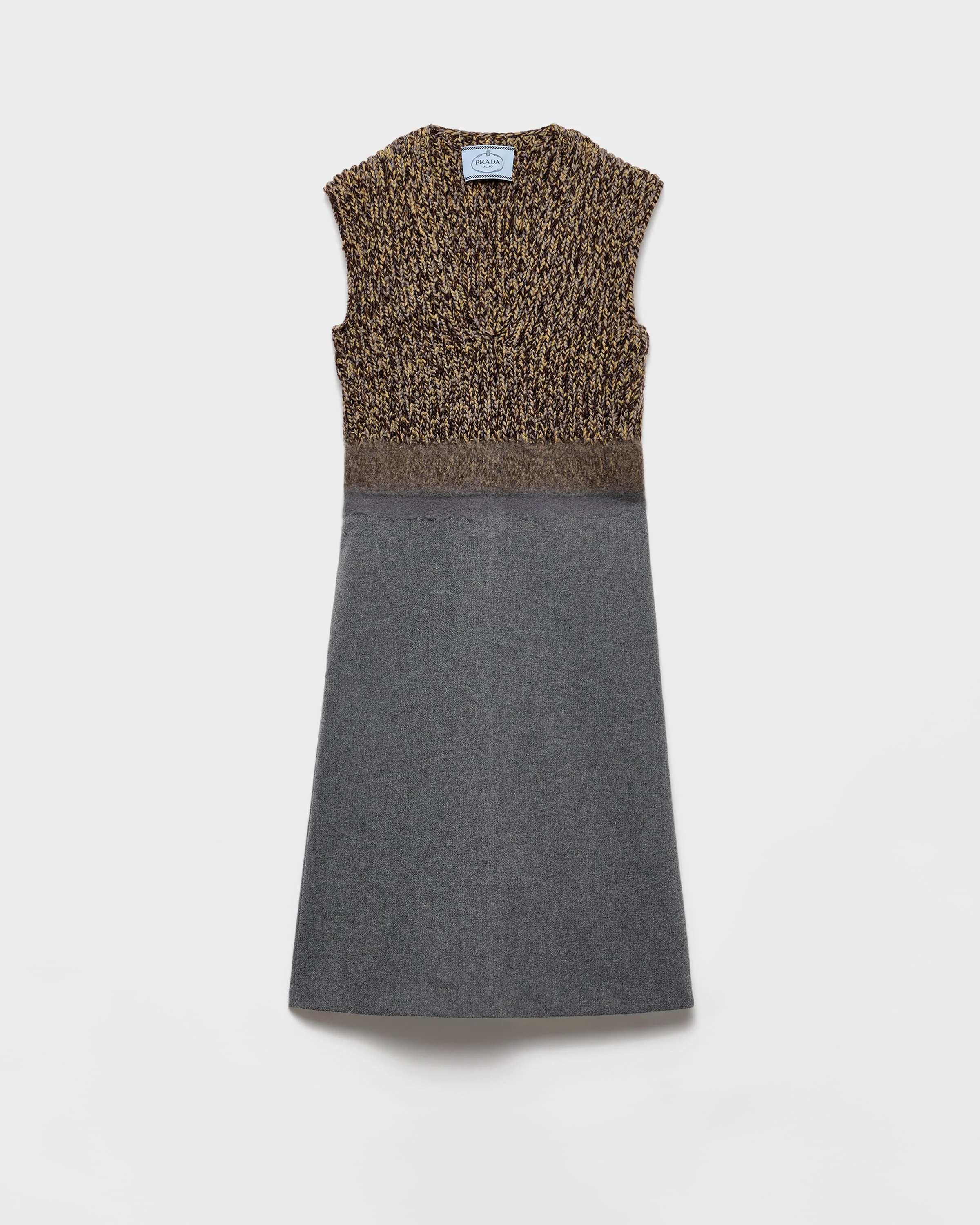 Pure lines and textured fabrics give a sophisticated character to this dress, an expression of the dialog between innovation and traditional tailoring. The silhouette is defined by the Shetland wool bodice with a plunging V neckline and the flared skirt in soft cashmere fabric. - Product code: P3Q26R_17Z6_F0480_S_OOO - Flared fit - Lined garment - Plunging V neck - Sleeveless - Inseam pockets - Fabric triangle logo - Flared hem - Imported - The model is 180 cm tall and wears a size 38 Height: 105cm MATERIALS Main material: 2% elastane 98% virgin wool
