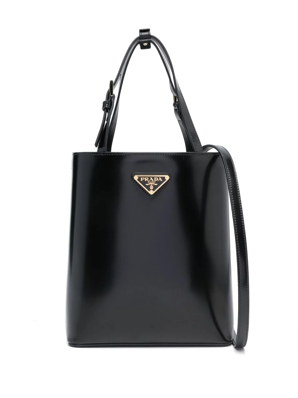 triangle logo-plaque bucket bag Defined by its curved edges and soft calf leather construction, Prada's bag embodies the house's timeless approach to accessories. With an adjustable top handle and a signature triangle logo plaque at the front, it's complete with a spacious main compartment. Highlights - Prada's tote bag crafted in black brushed leather with raised origami flowers motif. it features gold-tone hardware, adjustable handles and adjustable / removable shoulder strap. black leather-lined interior with flat pocket. the design is completed by the unmistakable enameled metal triangle logo on front. Composition Outer: Calf Leather 100% SIZE & FIT Model measurements Height 5 ft 10 in(1.77 m) Bust/Chest 34.64 in(88 cm) Hips 35.43 in(90 cm) Waist 24.8 in(63 cm) Measurement DEPTH 2.36 in(6 cm) HANDLE 4.72 in(12 cm) HEIGHT 9.05 in(23 cm) STRAP 21.65 in(55 cm) WIDTH 7.87 in(20 cm)