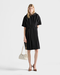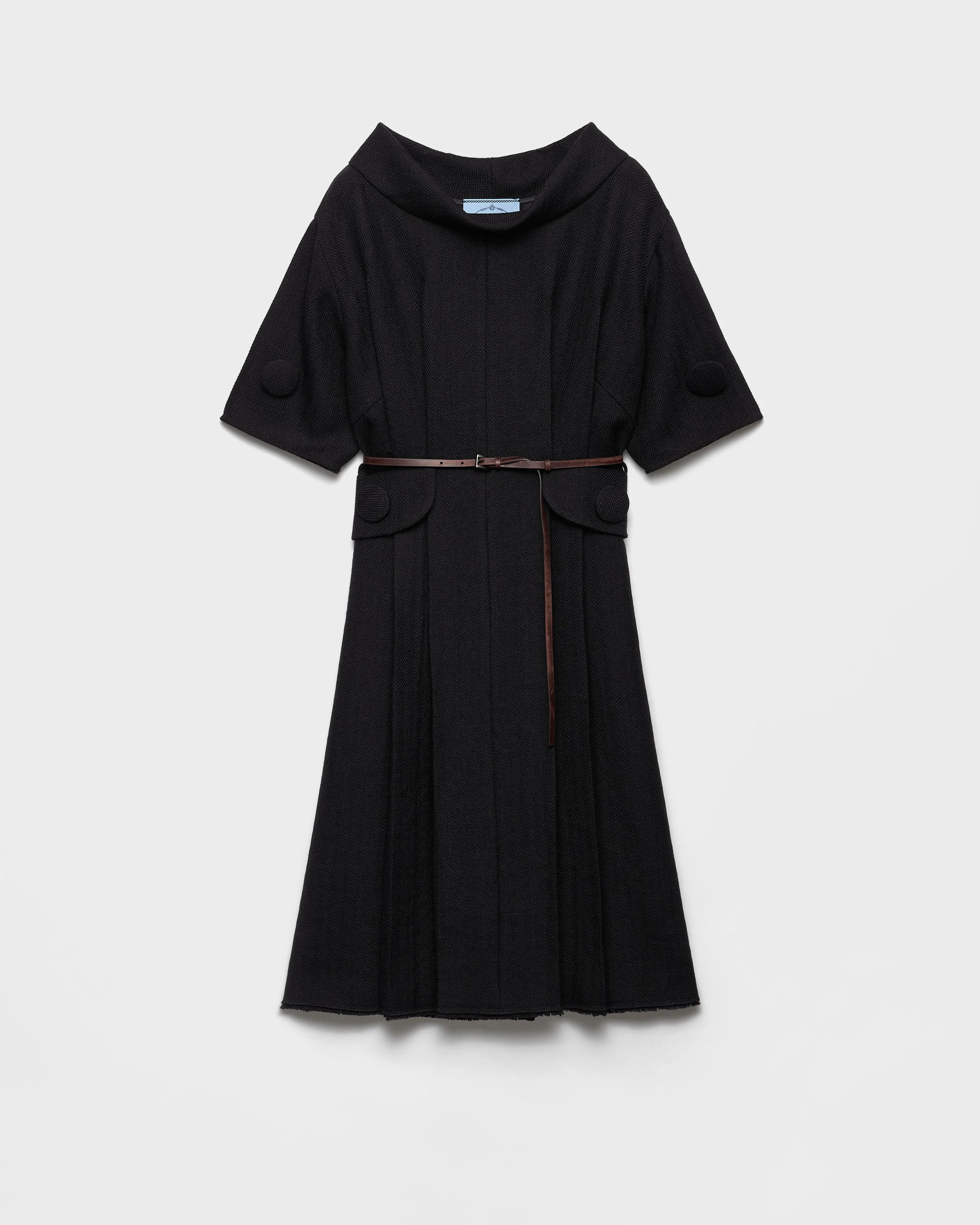 The Fall/Winter 2025 collection explores the concept of femininity and redefines its symbols, starting with the black dress. The silhouette is reimagined with new proportions, wide lines, and unique details. Made from chevron wool, this style features a boat neckline, a contrasting leather belt, and oversized buttons, while the raw-cut hem suggests an instinctive and unconventional elegance. - Product code: P3Q60K_18DE_F0002_S_OOO - Loose fit - Lined garment - Wide boat neckline - Short sleeves - Flap pockets - Center back slit - Straight hem - Leather belt - Imported - The model is 180 cm tall and wears a size 38 Height: 105cm MATERIALS Main material: 100% virgin wool