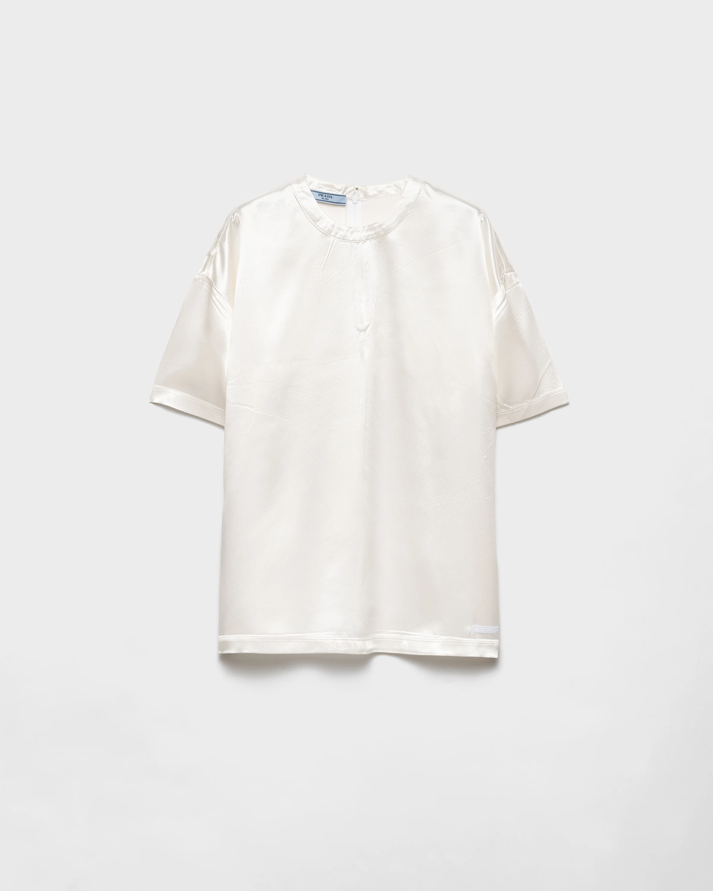 This top with a sleek, sophisticated design embodies contemporary, minimalist elegance. The short-sleeved silhouette is emphasized by the luminous satin finish. - Product code: P975M_15ZC_F0009_S_OOO - Loose fit - Unlined - Round neck - Center-back zipper closure - Short sleeves - Fabric triangle logo - Straight hem - Imported - The model is 180 cm tall and wears a size 38 Height: 60cm MATERIALS Main material: 54% acetate 46% viscose