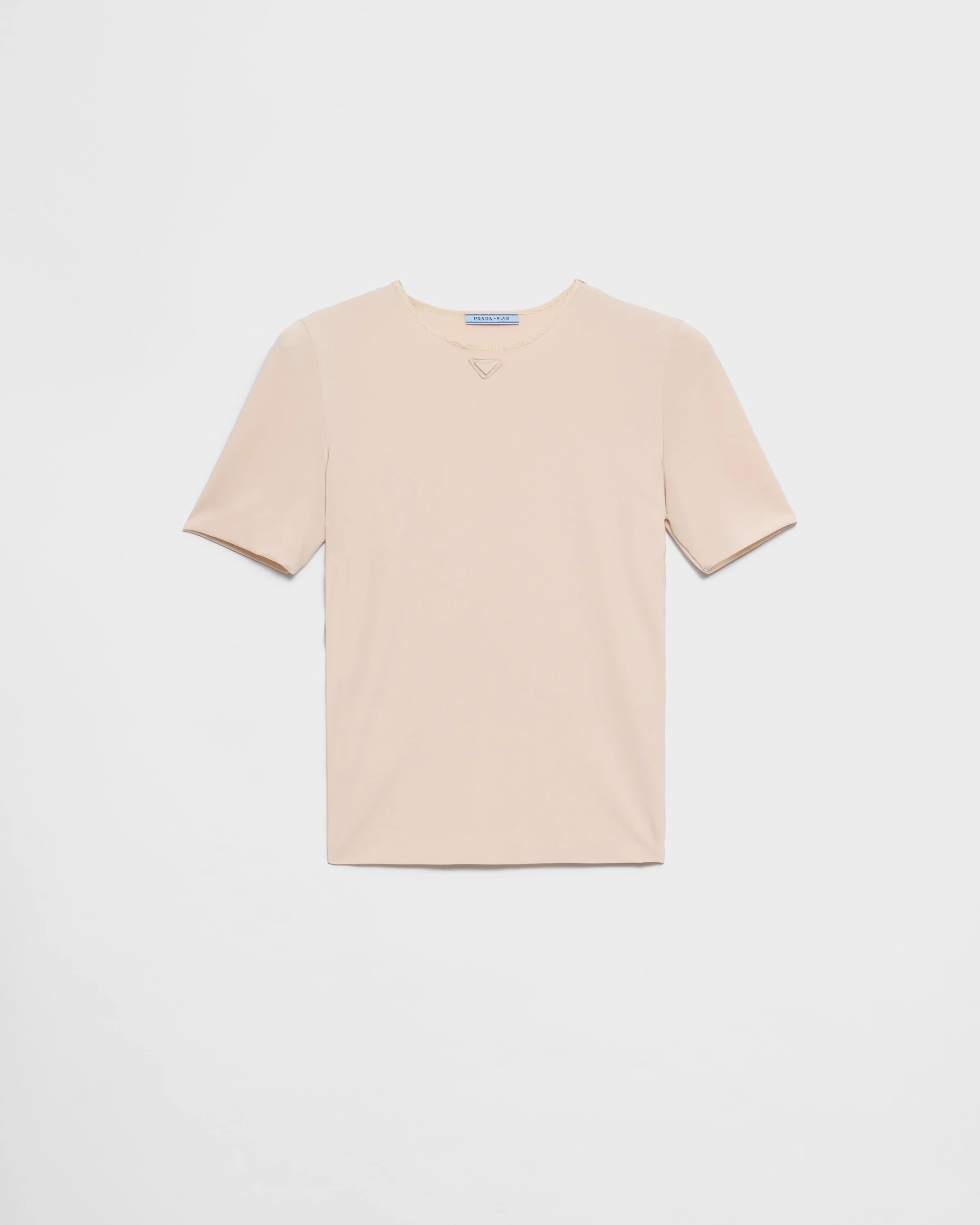This short-sleeved stretch fabric tee has a sleek silhouette with a slim fit, decorated with the iconic enameled metal triangle logo. - Product code: TS6192_17CP_F0770_S_OOO - Slim-fit silhouette - Crew neck - Short sleeves - Enameled metal triangle logo - Imported - The model is 178 cm tall and wears a size 38 Height: 58cm MATERIALS Main material: 13% elastane 87% polyamide