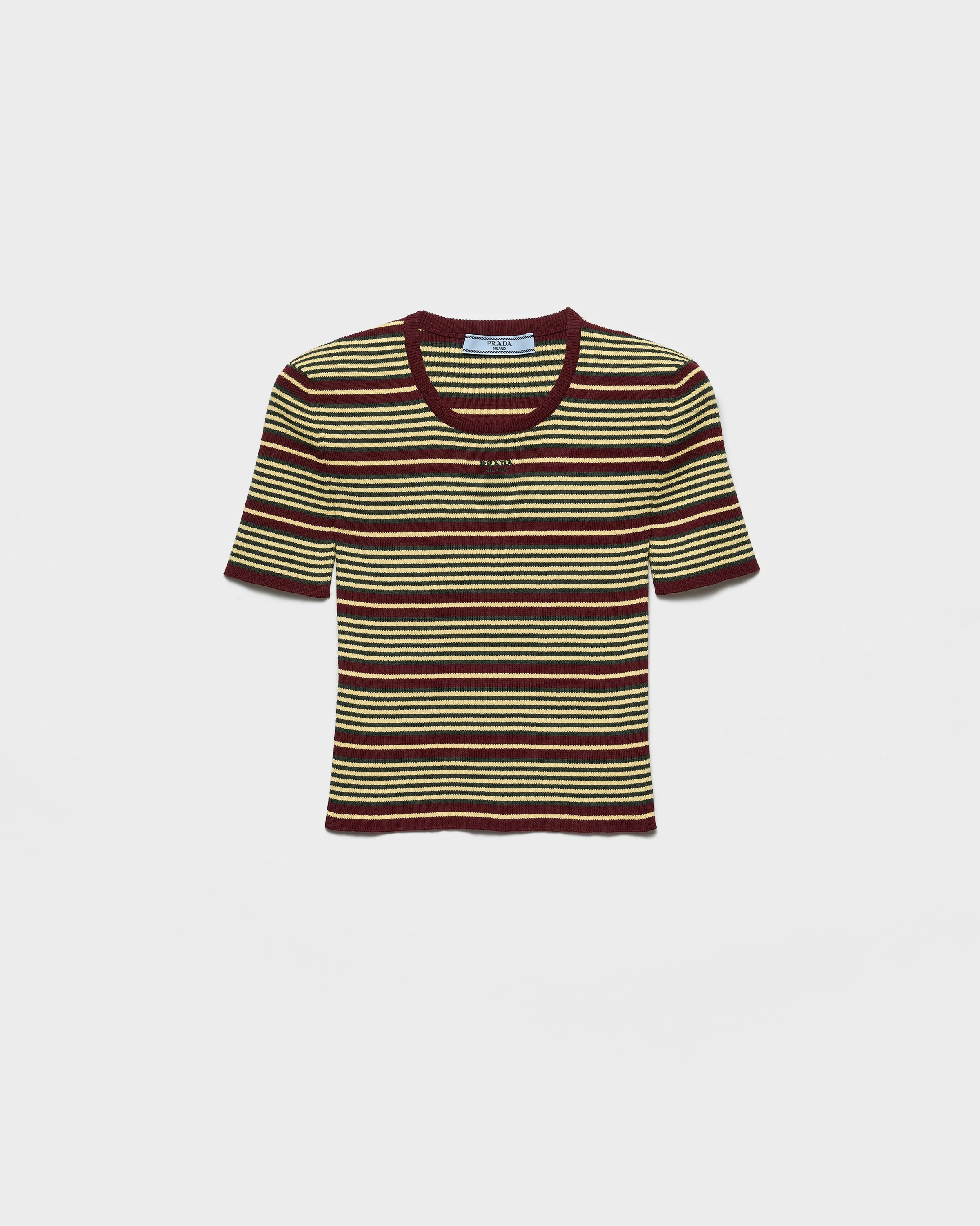 This cotton sweater is a refined interpretation of a summer classic with a casual, versatile character. The stripe motif animates the slim-fit silhouette with crew neck, completed with the embroidered logo in a contrasting color. - Product code: P24B3E_19IM_F0EJ5_S_OOO - Short sleeves - Ribbed knit - Slim fit - Ribbed knit crew neck - Regular shoulder - Ribbed knit sleeve trim and hem - Embroidered logo - Imported - The model is 180 cm tall and wears a size 38 Height: 48cm MATERIALS Main material: 100% Cotton