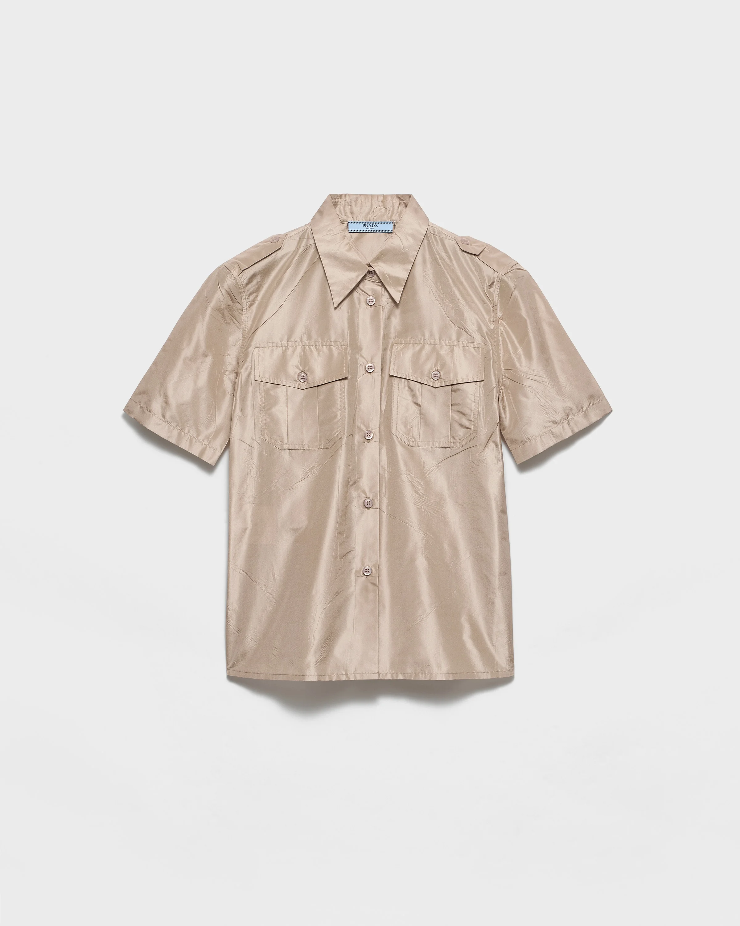 Unexpected interactions define this short-sleeved shirt, a pragmatic silhouette reinterpreted with the elegance of silk taffeta. The short-sleeved style combines softness and structure, delicacy and rigor. - Product code: P463I_120M_F0065_S_OOO - Straight fit - Classic collar - Front button closure - Short sleeves - Flapped patch pockets - Fabric triangle logo - Straight hem - Pressed garment - Imported - The model is 180 cm tall and wears a size 38 MATERIALS Main material: 100% silk