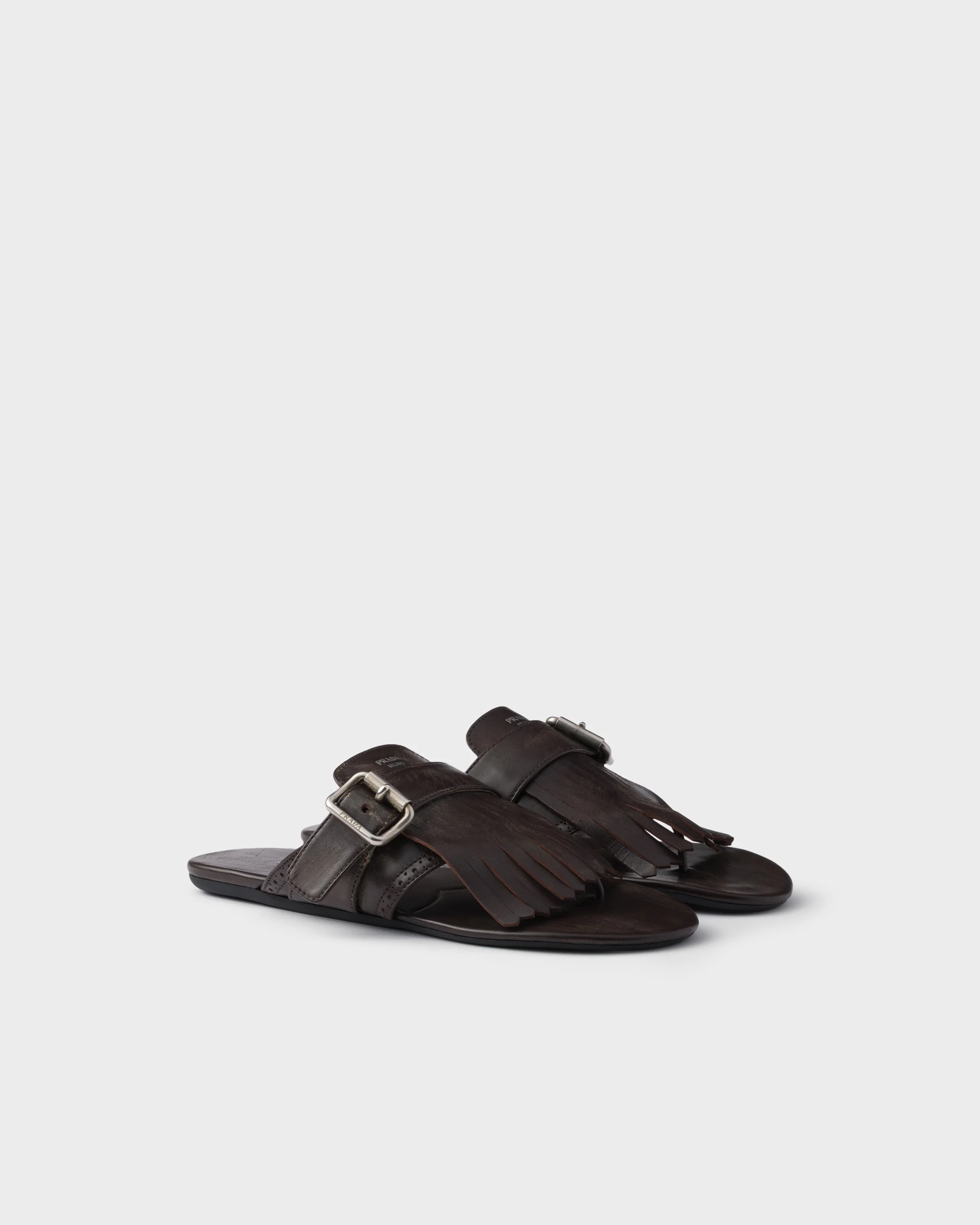These thong sandals, a reinterpretation of a classic formal shoe, feature a lightweight, flexible design. The refined Brogue motif, traditional fringe, and leather with a vintage finish create subtle contrasts with the casual and contemporary silhouette. - Product code: 1Y961N_070_F0003_F_A005 - Upper with strap and logo-engraved metal buckle - Screen-printed logo - Monoblock rubber sole, 5 mm, with hot-stamped logo - Imported MATERIALS Main material: Calfskin
