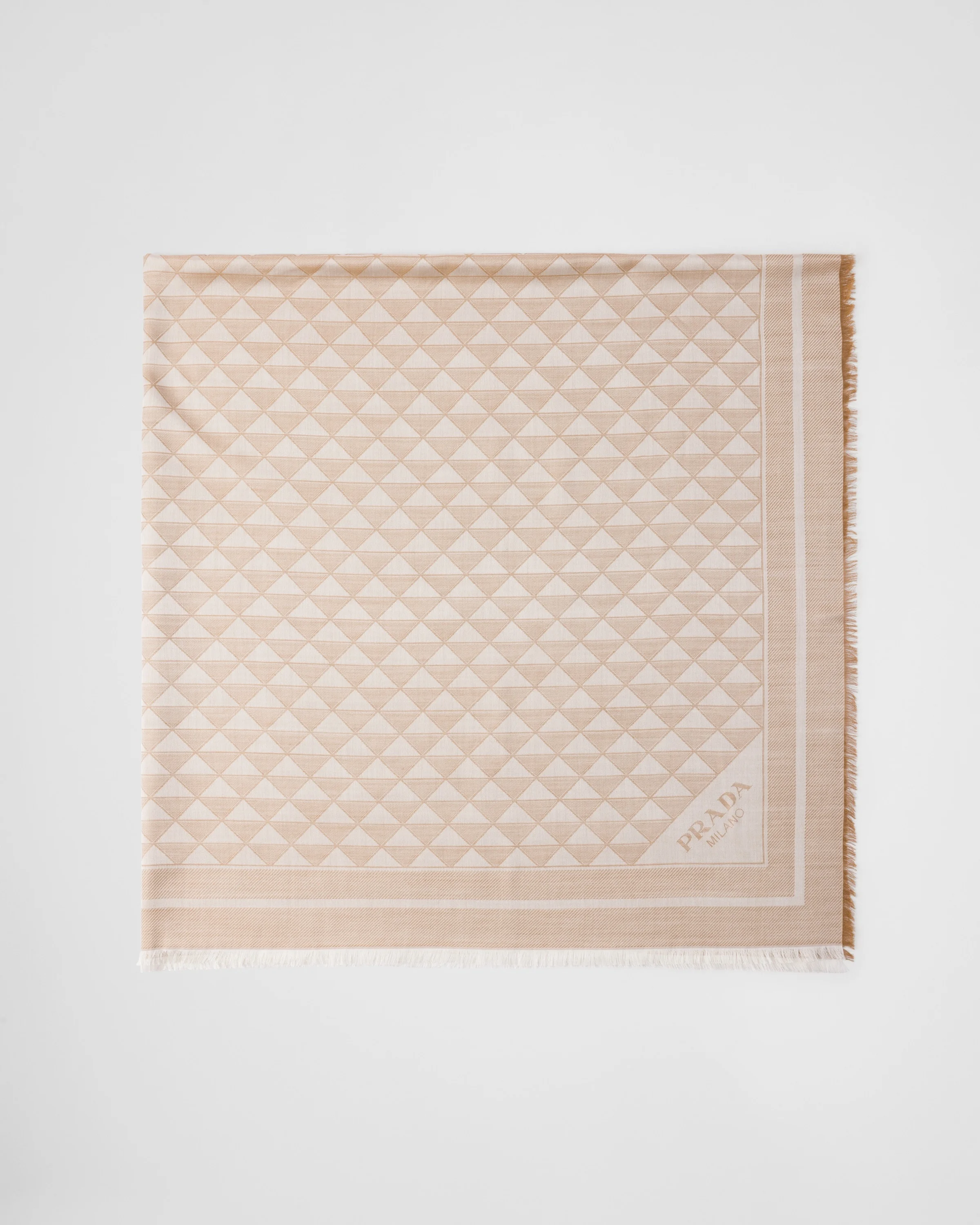 A fine silk-and-wool blend gives this shawl a soft, light feel enriched by the jacquard motif. The accessory defined by fringe on all four sides is decorated with the lettering logo. - Product code: 1FS086_2C6G_F045Y - Jacquard logo - Jacquard knit - Fringe on four sides - 78% silk 22% wool - Imported Height: 140cm Width: 140cm MATERIALS Cashmere