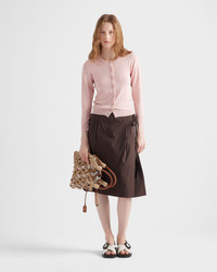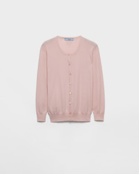This light silk and cotton cardigan has a slim fit and three-quarter sleeves. Simple and versatile, it is distinguished by its button closure and the discreet knit triangle logo. - Product code: P25N65_17IN_F0AL2_S_OOO - Three-quarter sleeve - Plain knit - Slim-fit silhouette - Semi-raglan shoulder - Ribbed knit cuffs and hem - Knit triangle logo - Front button closure - Imported - The model is 176 cm tall and wears a size 38 Height: 62cm MATERIALS Main material: 38% cotton 62% silk