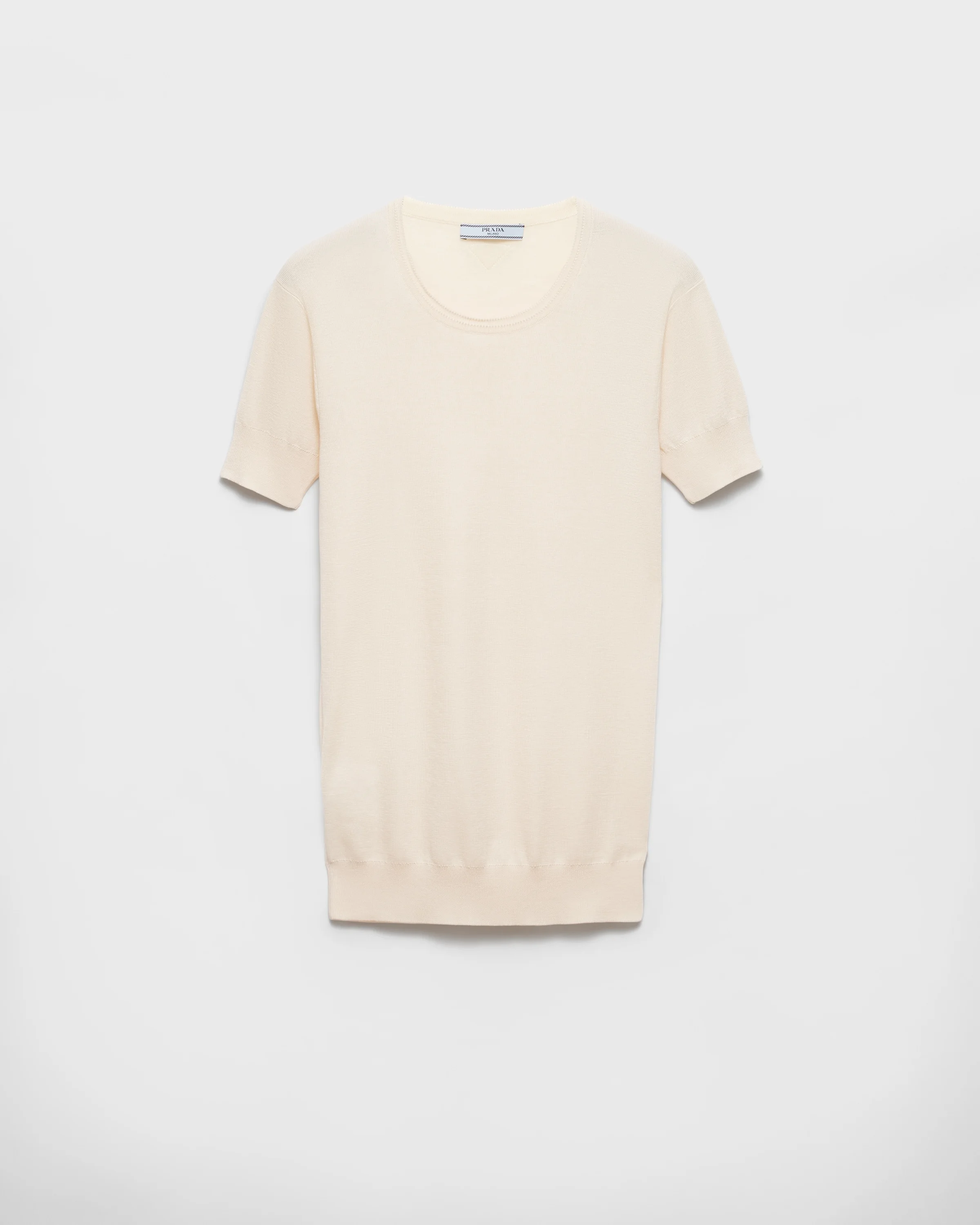 This silk and cotton short-sleeved sweater, a Prada wardrobe classic, has a sleek silhouette. The short-sleeved style with ribbed knit crew-neck, sleeve trim and hem is completed by the tonal triangle logo. - Product code: P24R2L_17IN_F0018_S_OOO - Short sleeves - Plain knit - Slim fit - Semi-raglan shoulder - Ribbed knit sleeve trim and hem - Knit triangle logo - Imported - The model is 181 cm tall and wears a size 38 Height: 62cm MATERIALS Main material: 38% cotton 62% silk