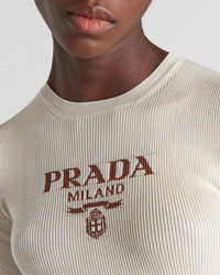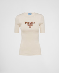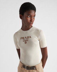 Pragmatism and everyday life inspire a series of simple silhouettes that contrast with eclectic ensembles and eye-catching garments, creating new languages and balances. Defined by a slim fit and ribbed knit, this short-sleeved crew-neck sweater is made of silk and features the intarsia lettering logo on the front. - Product code: P24T1F_11MY_F0304_S_222 - Short sleeves - Ribbed knit - Slim fit - Ribbed knit crew neck - Regular shoulder - Intarsia logo - Imported - The model is 178 cm tall and wears a size 38 Height: 62cm MATERIALS Main material: 100% recycled silk