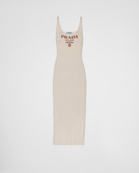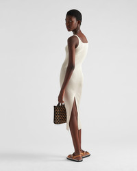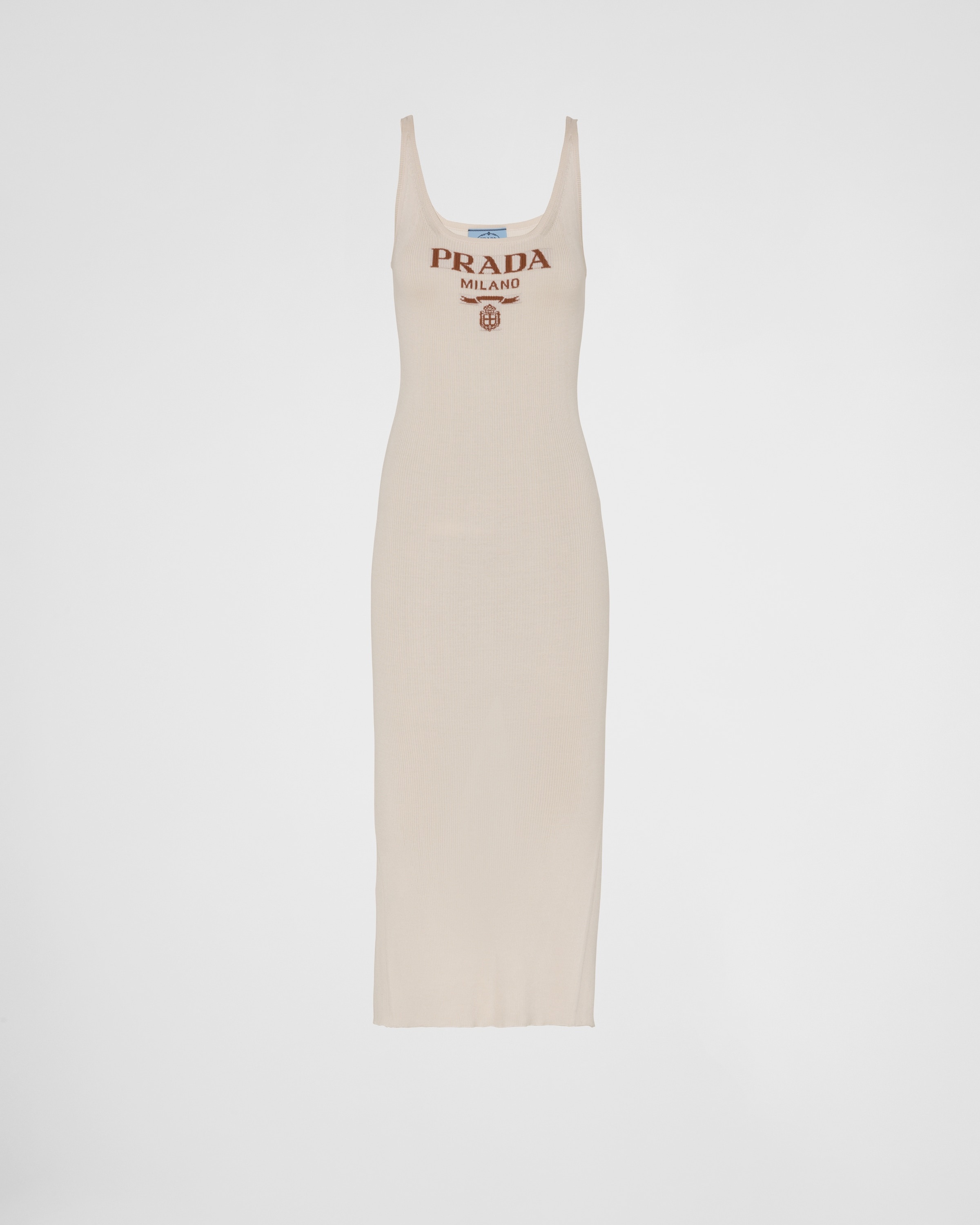 Fine materials and elegant lines meet daywear workmanship, creating new languages and balances. Defined by a slim fit silhouette and ribbed knit motif, this dress with bold allure and a high slit on the back is made of silk and is enhanced with the intarsia lettering logo on the front. - Product code: 23901_11MY_F0304_S_222 - Ribbed knit - Slim fit - Scoop neck - Intarsia lettering logo - Imported - The model is 178 cm tall and wears a size 38 - Height: 125cm MATERIALS Silk