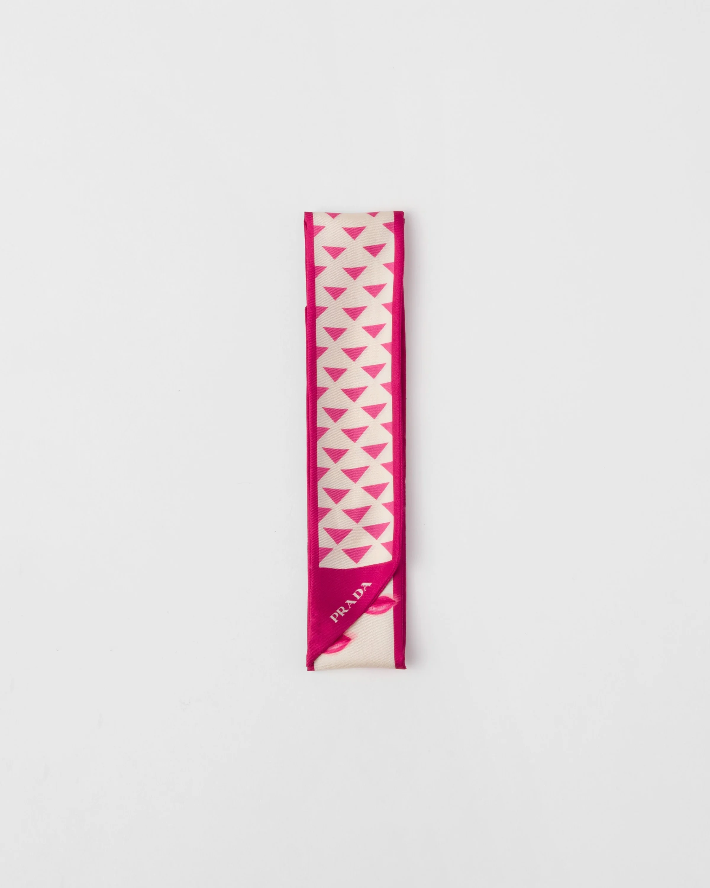 Two contrasting prints blending iconic geometric shapes and archive motifs spark a play of duality and contrasts that characterizes Prada collections, animating this silk skinny scarf. - Product code: 1FF008_2C7H_F039K - Prints: Degrade and Mouths - Printed logo - Imported Height: 85cm Width: 6cm MATERIALS Main material: Silk