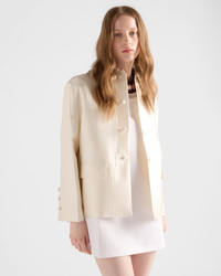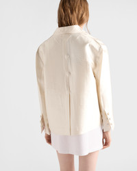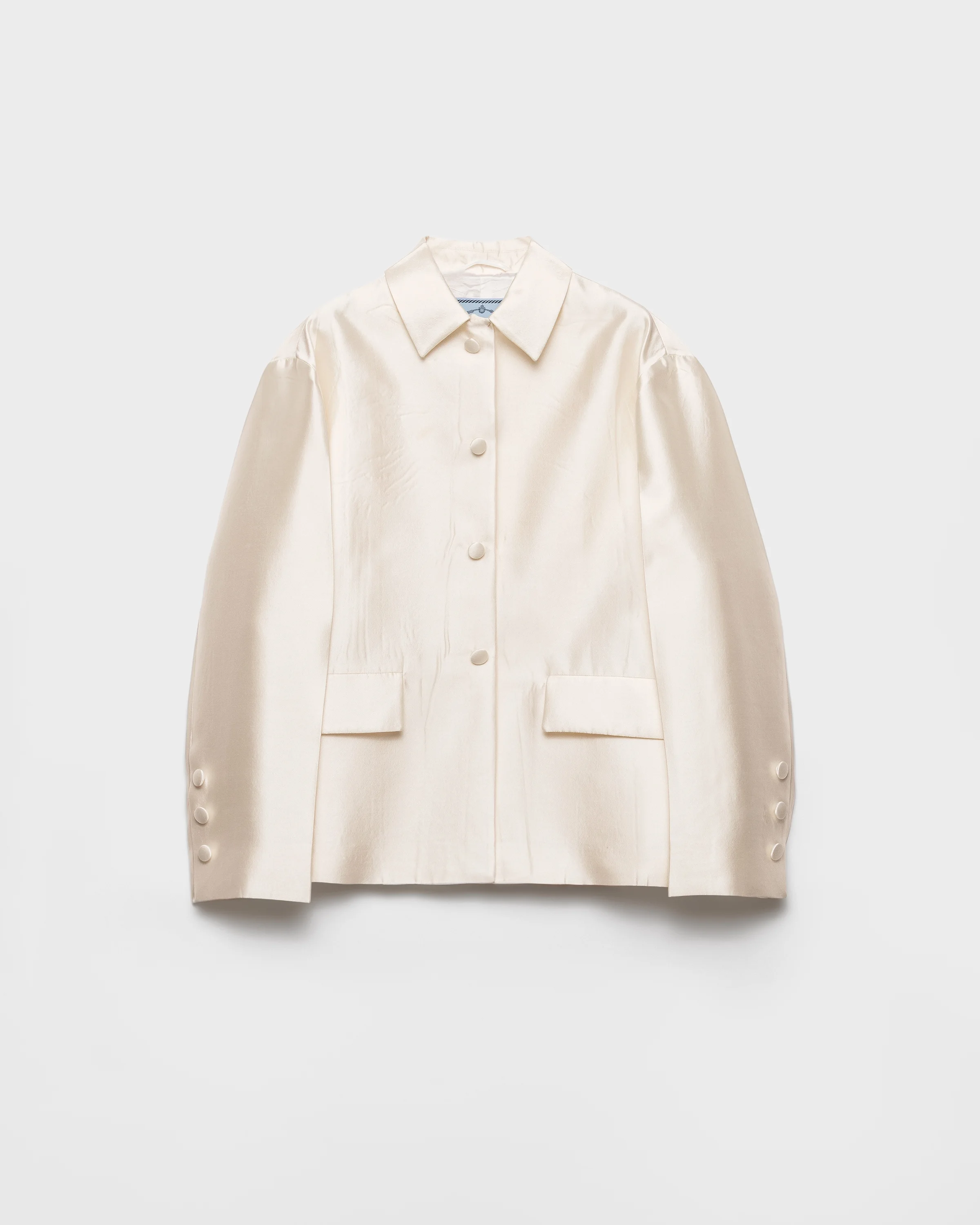 Prada elegance composed of unexpected touches and unconventional details is expressed through the design of this sophisticated jacket. The wool and silk garment combines the finely tailored silhouette with a deliberately imperfect finish that adds depth and character to the design. - Product code: P507HY_BH7_F0009_S_OOO - Straight fit - Lined garment - Fabric-covered button closure on the front - Straight three-button cuffs - Flap pockets - Back vent - Fabric triangle logo - Imported - The model is 176 cm tall and wears a size 38 Height: 63cm MATERIALS Main material: 52% silk 48% wool