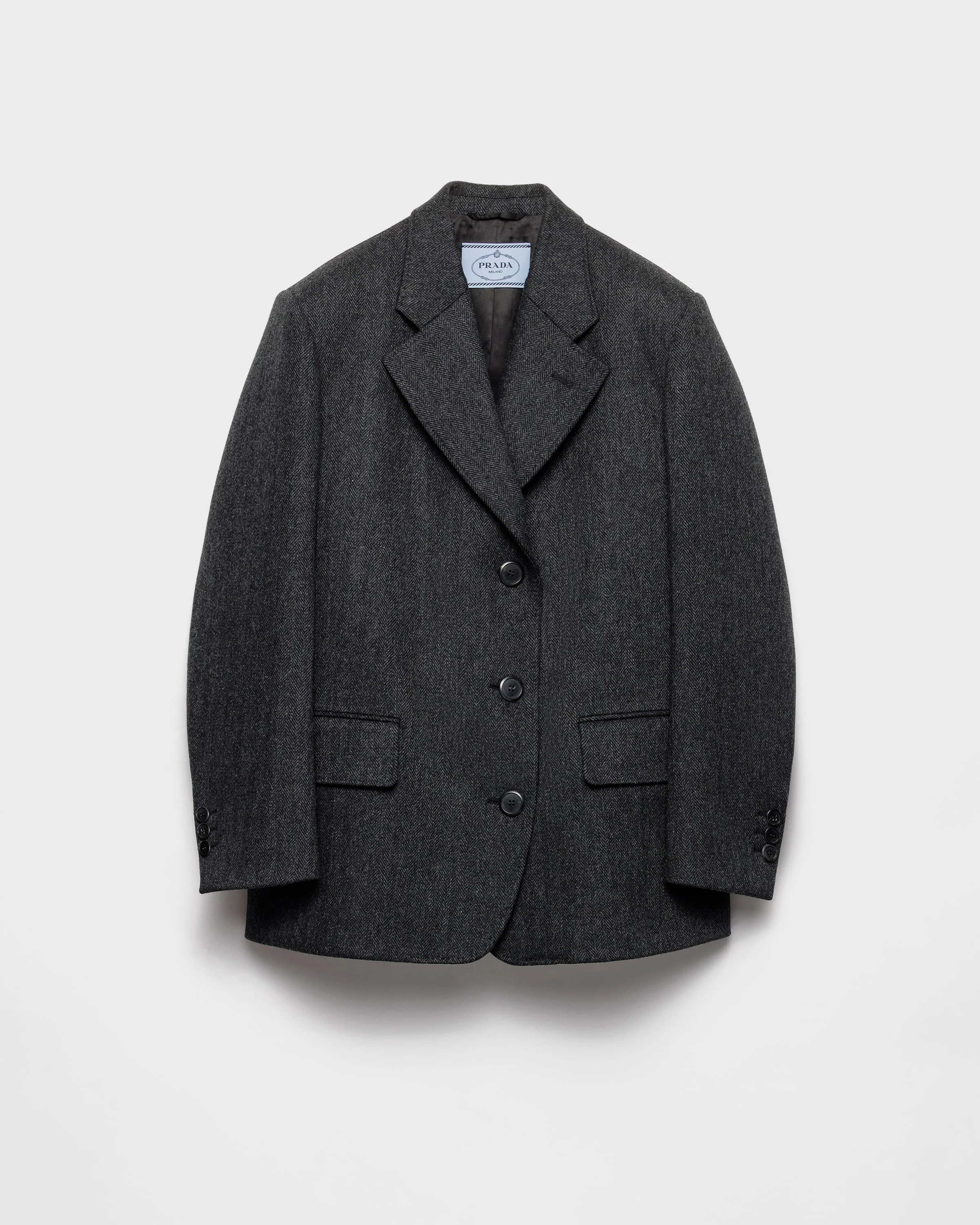 The chevron pattern intertwines with a tailored design that reimagines masculine lines. A notch lapel, buttons and knit triangle logo complete a garment that combines formal rigor and tactile sensibility with the Prada language. - Product code: P664RG_171T_F0308_S_OOO - Menswear fit - Lined - Notch lapel - Front button closure - Straight three-button sleeves - Flapped patch pockets - Knit triangle logo - Imported - The model is 177 cm tall and wears a size 38 Height: 76cm MATERIALS Main material: 100% virgin wool