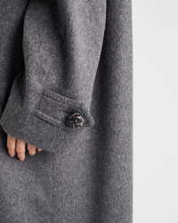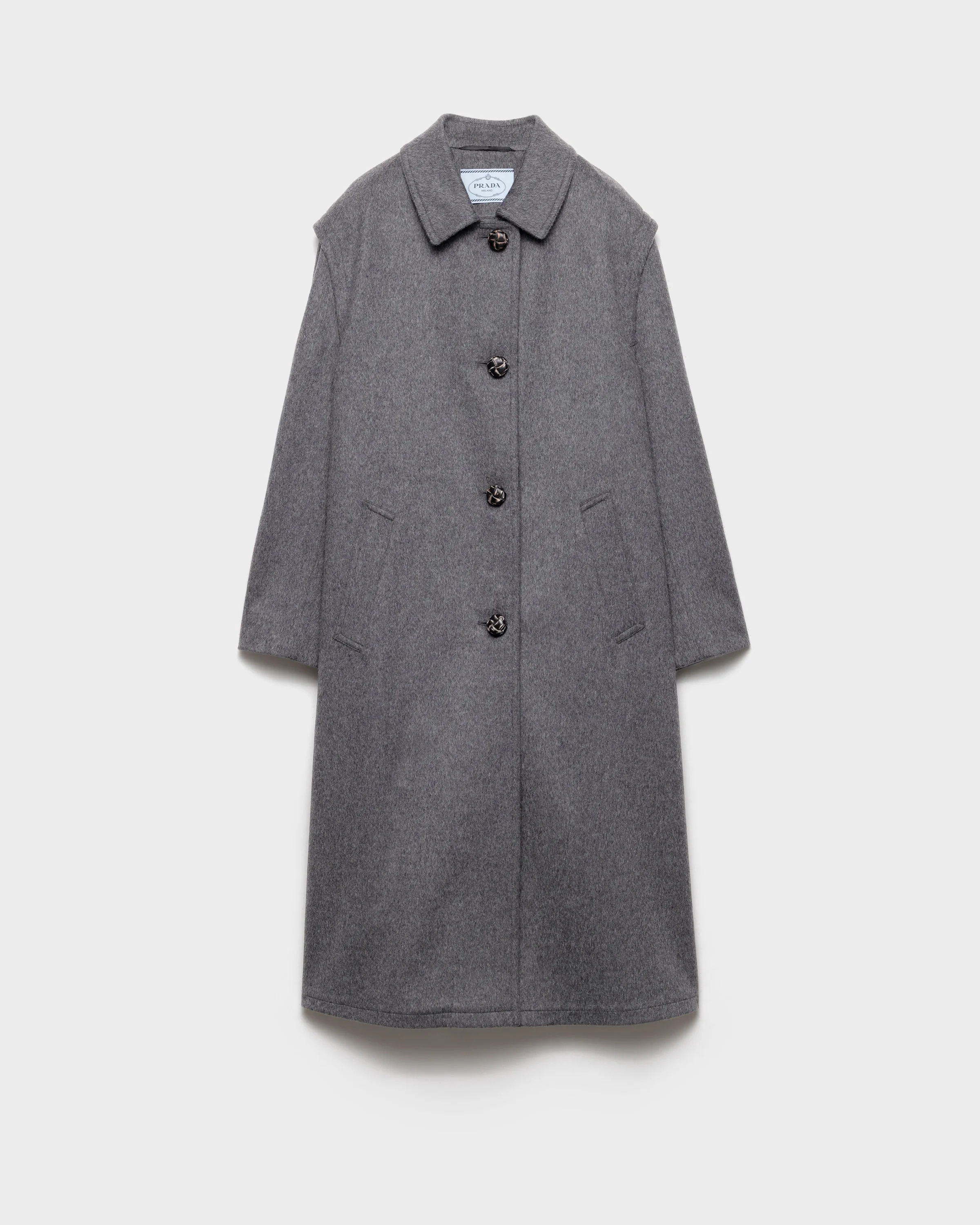 This oversized, unlined coat made of double loden cloth celebrates the pure lines and quality of the materials. Leather-covered buttons and the triangle logo add authentic, structured elegance. - Product code: P657SE_C2O_F0480_S_OOO - Oversized fit - Unlined - Shirt-style collar - Leather-covered button closure on the front - Sleeves with straps and buttons - Flap pockets - Back vent - Leather triangle logo - Imported - The model is 178 cm tall and wears a size 38 Height: 120cm MATERIALS Main material: 100% virgin wool