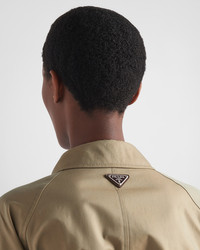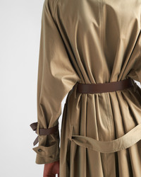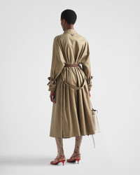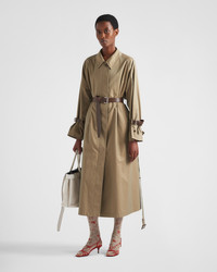 This cotton twill trench coat features a menswear-inspired silhouette reinterpreted with refined, contemporary details. A sleek leather belt enhances the oversized style, characterized by a shirt-style collar and leather straps on the sleeves. The enameled metal triangle logo completes the sophisticated outerwear with an iconic note. - Product code: P652RK_14ZF_F0393_S_OOO - Menswear fit - Lined - Shirt-style collar - Front button closure with fabric belt - Wide sleeves with leather strap and tabs - Flap pockets - Back vent - Leather belt - Enameled metal triangle logo - Imported - The model is 180 cm tall and wears a size 38 Height: 126cm MATERIALS Cotton