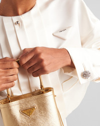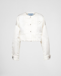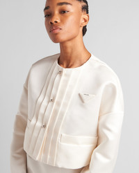 This slightly cropped double satin jacket expresses absolute elegance. Refined jewel buttons stand out next to the pleating alongside the button placket. This jacket made of a lustrous fabric with sophisticated allure is decorated with the three-dimensional fabric triangle logo with printed lettering logo. - Product code: P516N_393_F0009_S_231 - Loose fit - Round neck - Front button closure - Straight sleeves - Jewel button - Welt pockets - Three-dimensional printed fabric triangle logo - Height: 48cm MATERIALS Silk