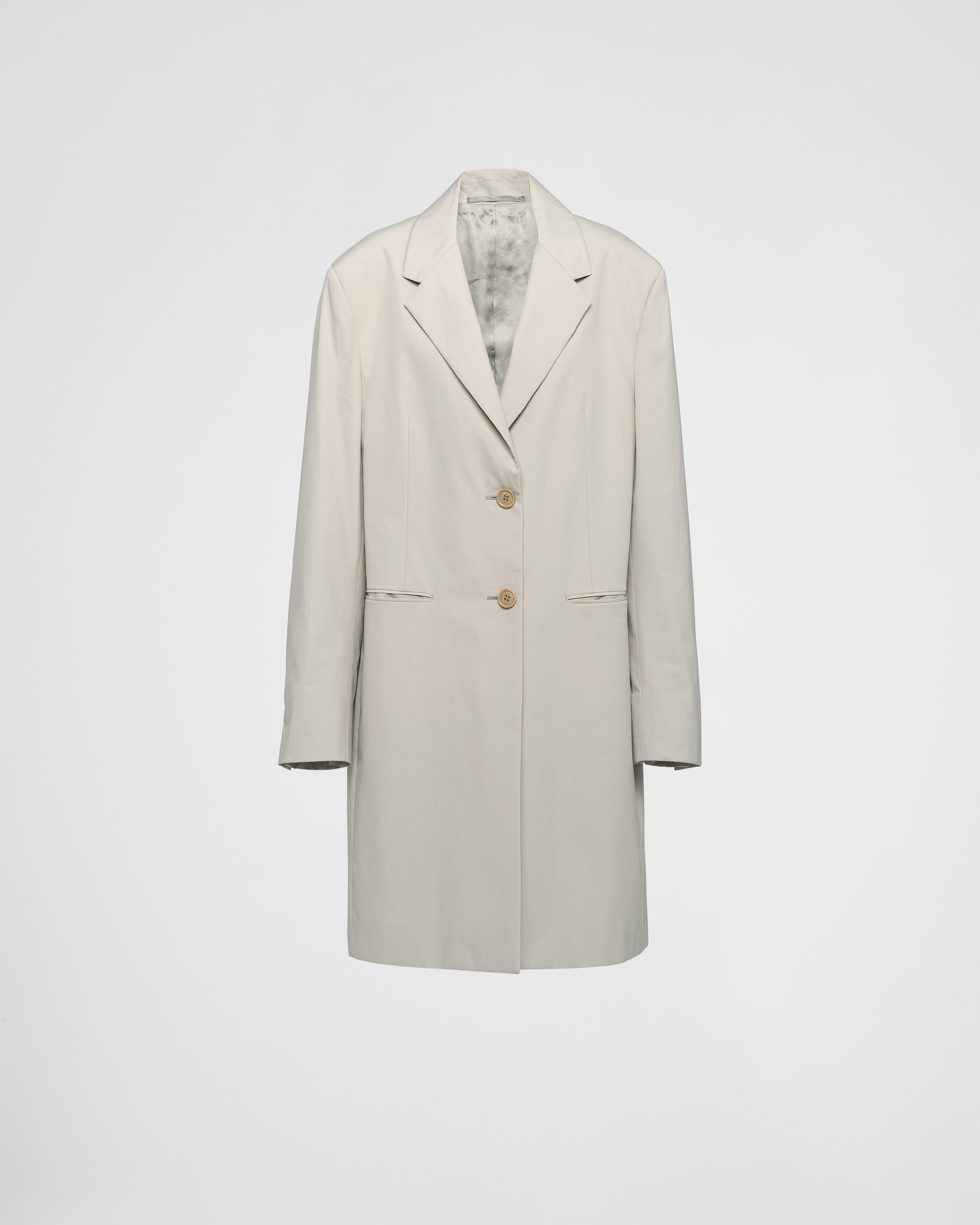 A menswear fit and iconic details meet in this Panama cotton coat with sleek details. Accented with welt pockets and back vent, the garment is decorated with the triangle logo made of Shetland wool that creates a harmonious contrast in texture. - Product code: P646Q_1123_F0A08_S_231 - Menswear fit - Lined - Classic lapel - Two-button front closure - Straight three-button sleeves - Flapped welt pockets - Back vent - Shetland wool triangle logo - Height: 105cm - Imported MATERIALS Cotton