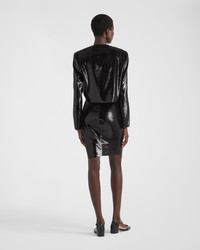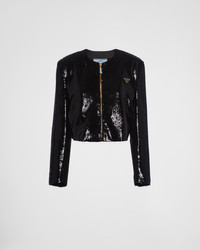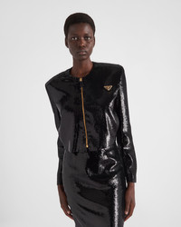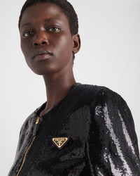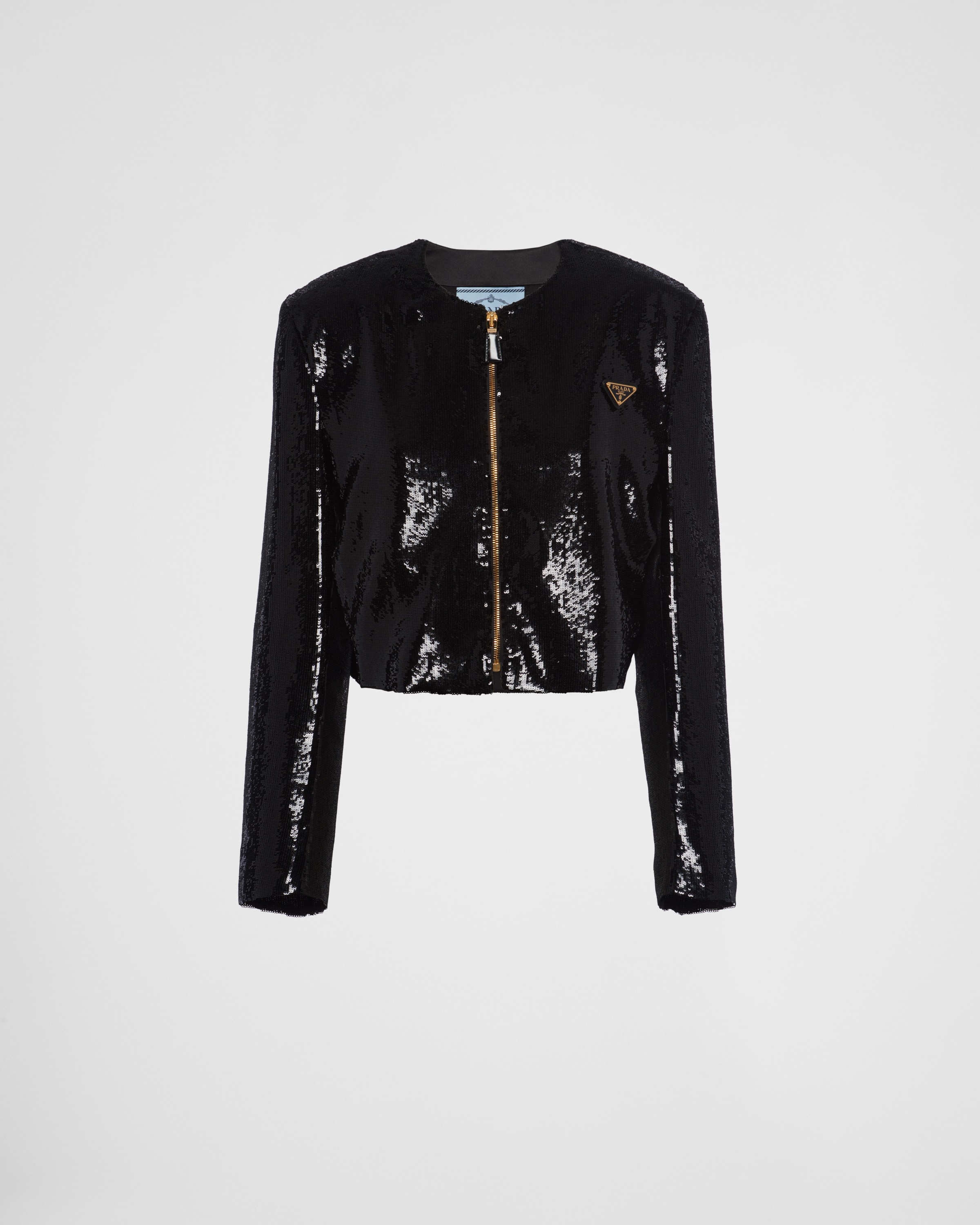 This single-breasted sequin jacket with boxy silhouette features elegant lines and shimmering details. The bold and sophisticated constructed and slightly cropped garment is defined by the round neckline and the zipper closure in a contrasting color. The triangle logo completes the distinctive design with an iconic touch. - Product code: P530OR_136W_F0002_S_OOO - Straight fit - Organza lining - Round neck - Front zipper closure - Straight sleeves - Leather triangle with enameled metal triangle logo - Imported - The model is 177 cm tall and wears a size 38 Height: 48cm MATERIALS Silk
