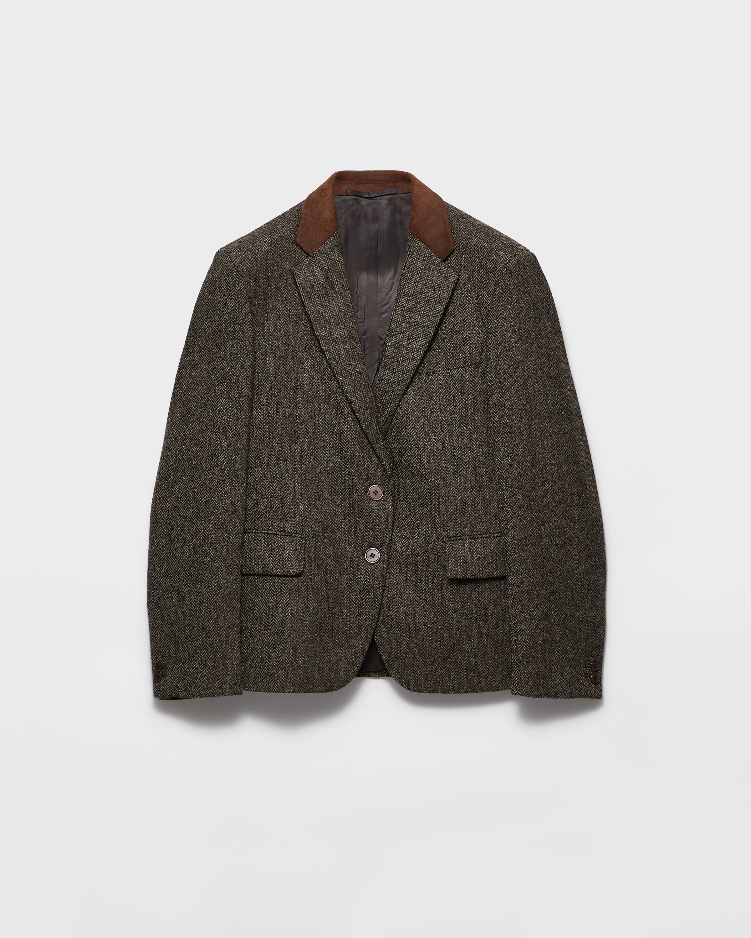 Sophisticated winter textures enrich this jacket with retro charm. The garment made from Shetland wool with a chevron pattern features a masculine cut with classic lapels trimmed with a suede insert. - Product code: P593P_18VB_F0AAU_S_OOO - Menswear fit - Lined garment - Notch lapels with suede detail - Front button closure - Sleeves with buttons - Flapped welt pockets - Back vent - Shetland wool triangle logo - Imported - The model is 178 cm tall and wears a size 38 Height: 70cm MATERIALS Main material: 100% virgin wool